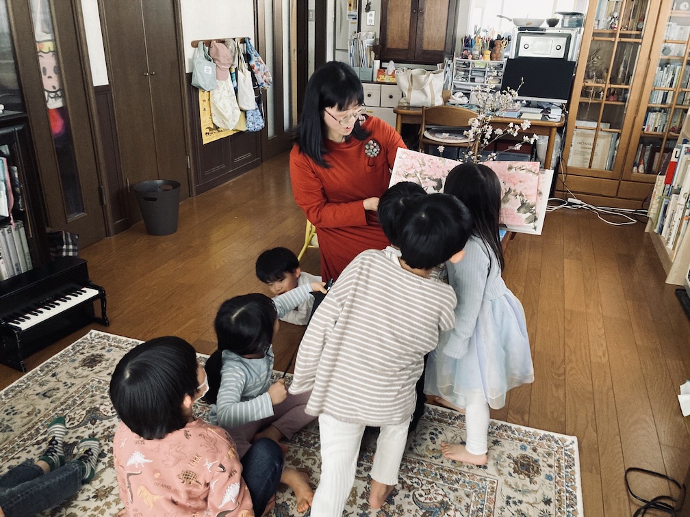 3冊目の『さくら』。今時季にぴったりで、桜の木の仔細な変化を捉え、蕾の先・芽の先まで丁寧に描いている秀逸な本ではあるのですが、後半になってくると子ども達も集中が切れ、落ち着きない様子に…。実際に桜を見れたらと思い、私のすぐ後ろにセットしていた枝物の「啓翁桜」のことなどすっかり忘れ、読むことで精一杯になってしまいました。桜を実際に観察し、蕾の先の色がどうなっているのか、はっぱの赤ちゃんはどのへんにあるのか触れればよかったな〜と後で思いました。