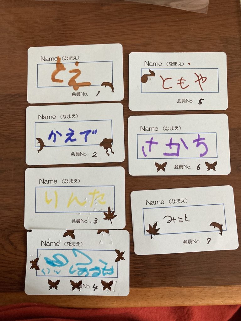 その後、1階に集まってきた子ども達と、メンバーカード作りをやりました。文庫に来たら、毎回スタンプを1つずつ押していくと楽しいだろうなと思ったからです。好きな穴あけパンチで紐を通す穴をあけ、一緒に名前をひらがなで書いてカードは完成!