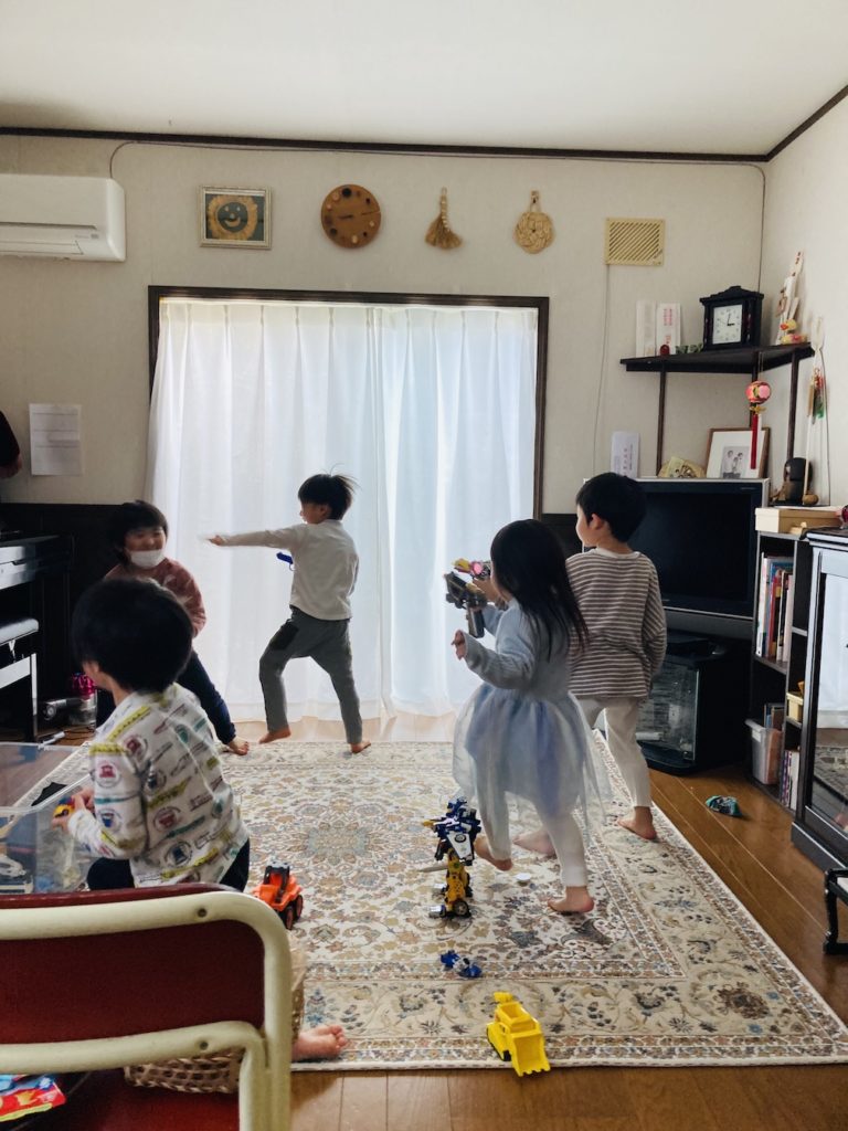 なんとか5冊を読みきり、読み聞かせは終了。ここで、時計を見たらもう14:30過ぎ!この時点で1時間超えでした!この頃には子ども達もお腹が空いてきたようで、「おせんべい食べる?」「お茶飲む?」と誘うと、それぞれに集まってお菓子やお茶を口にしていました。と同時に、やはり子ども!息子のおもちゃを2階から持ってきて、あっという間に辺りは保育園での室内遊び状態に。ここまでくるともう文庫ではなくなっていたので、私も文庫モードは終了。遊びに付き合ってみたり、声をかけたりして終了時間の15時まで、休憩しながら過ごしました。