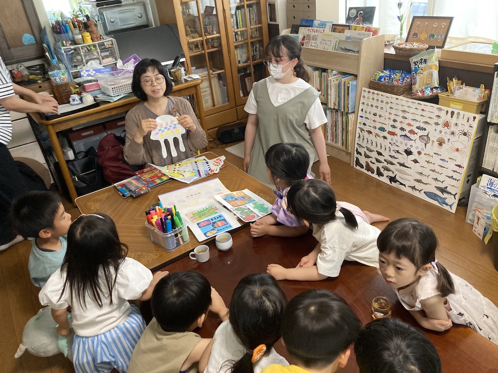 前回6月が誕生日会スペシャルということで内容を詰め込みすぎた反省もあり、少しスローダウンしようとのぞんだ今回。童謡「うみ」の歌、読み聞かせ、「海のいきもの」づくり、DVD鑑賞という内容でしたが、やはり予定どおりにはいかないものですね…