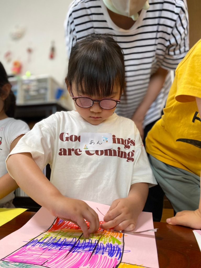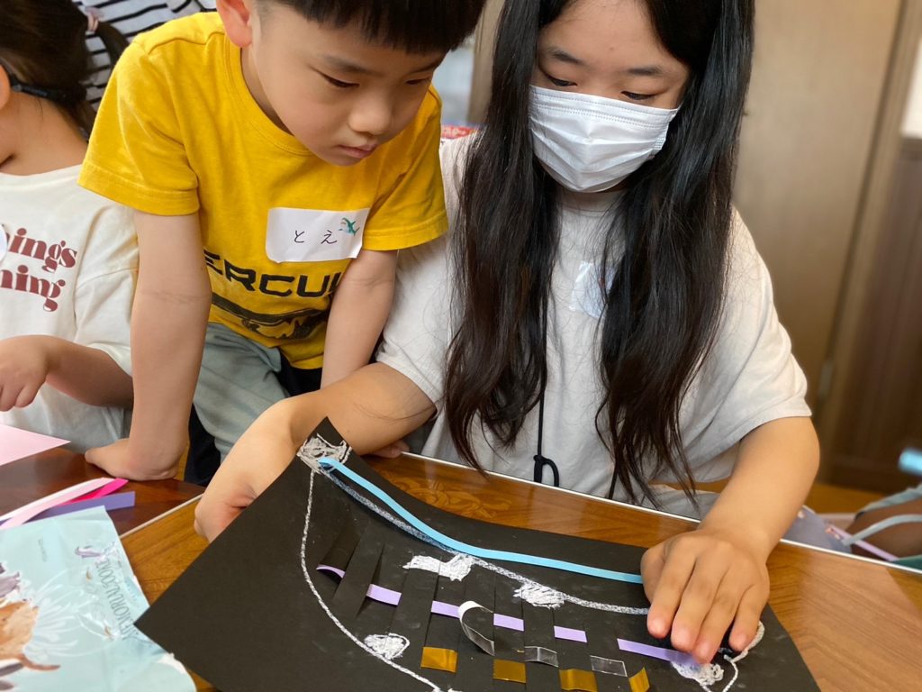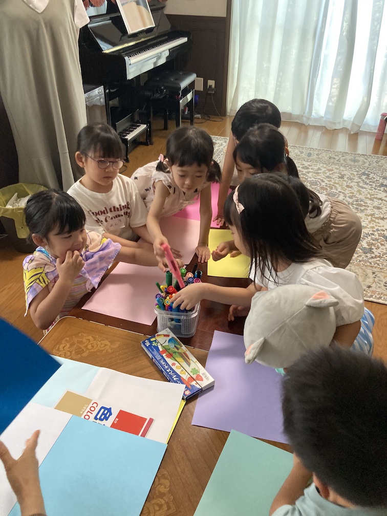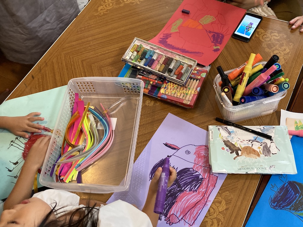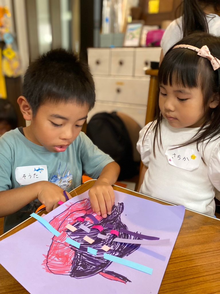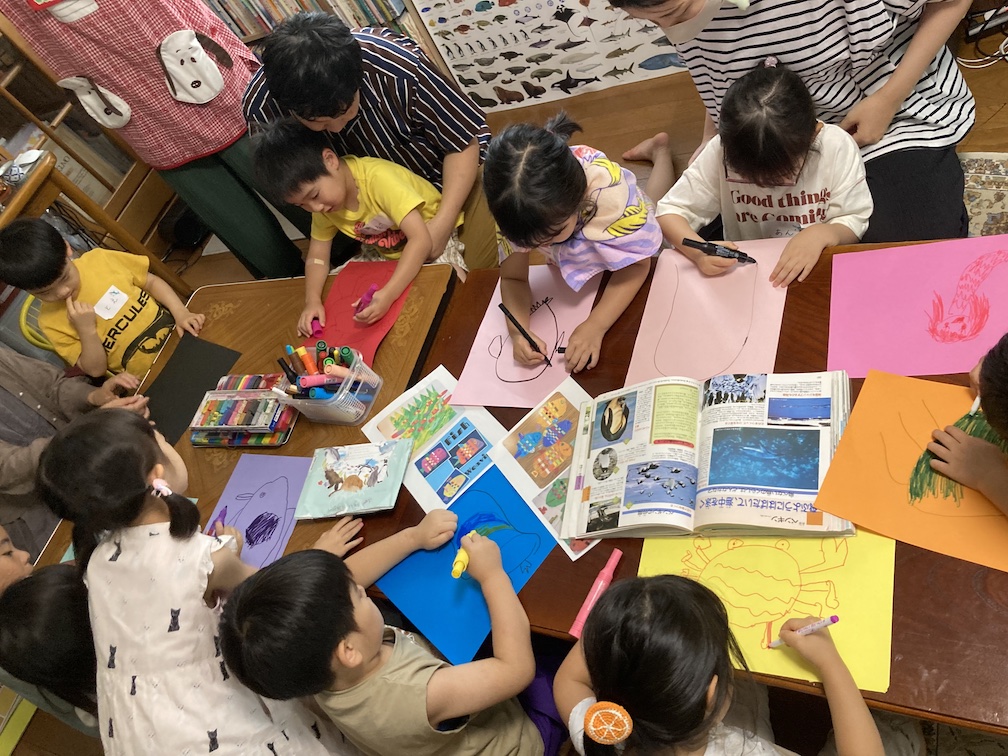 読み聞かせの後は、お菓子を少し頬張ってから、紙織りで「海の生き物」づくりをやりました。一人一人好きな色画用紙を選び、「自分の思いえがく海の生き物を描いてごらん」と言って、ペンなどで絵を描いてもらいました。とはいっても、いきなり描くのは難しいかなと思ったので、水族館の生き物のポスターや図鑑などを準備して、見ながらでもいいよと伝えました。すると、私が見本で示したカニを描く子ども、一人の女の子が「ペンギン描きたい」と言ったら、他の数人もペンギンを描き始めたりと数人が同じモチーフで描くという結果に(笑)。またある女の子は「私は人魚がいい」と描く子もいて、なかなか面白かったです。