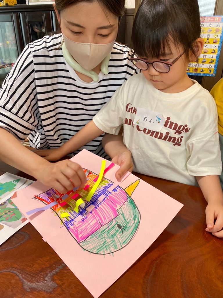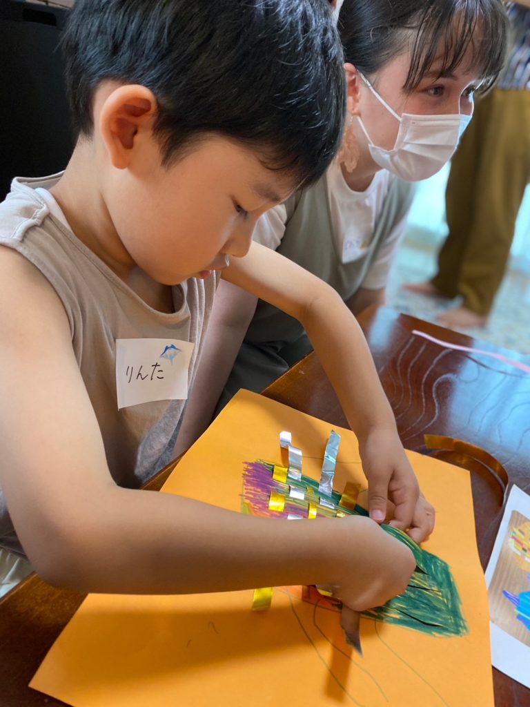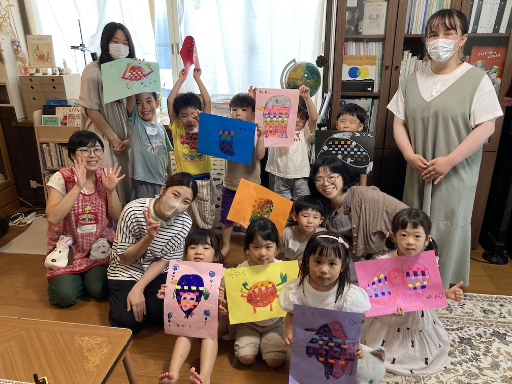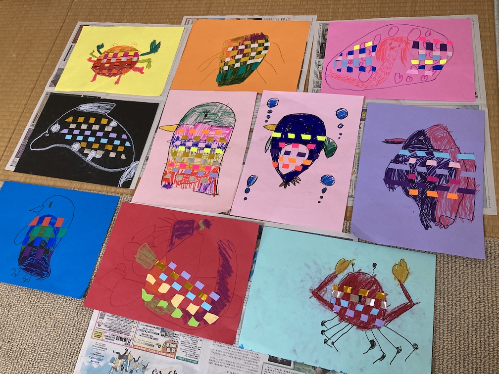 「紙織り」というのは、織物のように短冊状の紙を下地となる紙の切り込みを入れた部分に上下に織り込んでいく方法で、斜めにしたり、下地の切り方をくねくねにしたり、短冊の太さや形に変化をつけると多様な模様ができあがって面白い作品になります。今回は、私が事前に用意した短冊状の紙を選んで編み込んでもらいました。けっこう4,5歳児でも紙織りができるもんだな〜というのが正直な感想。2人のママさん、ポオラさんのおかげで、なんとか9人分の作品が時間内に完成!とてもかわいく素敵な海の生き物たちができあがりました!!