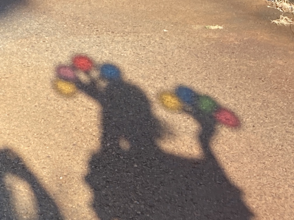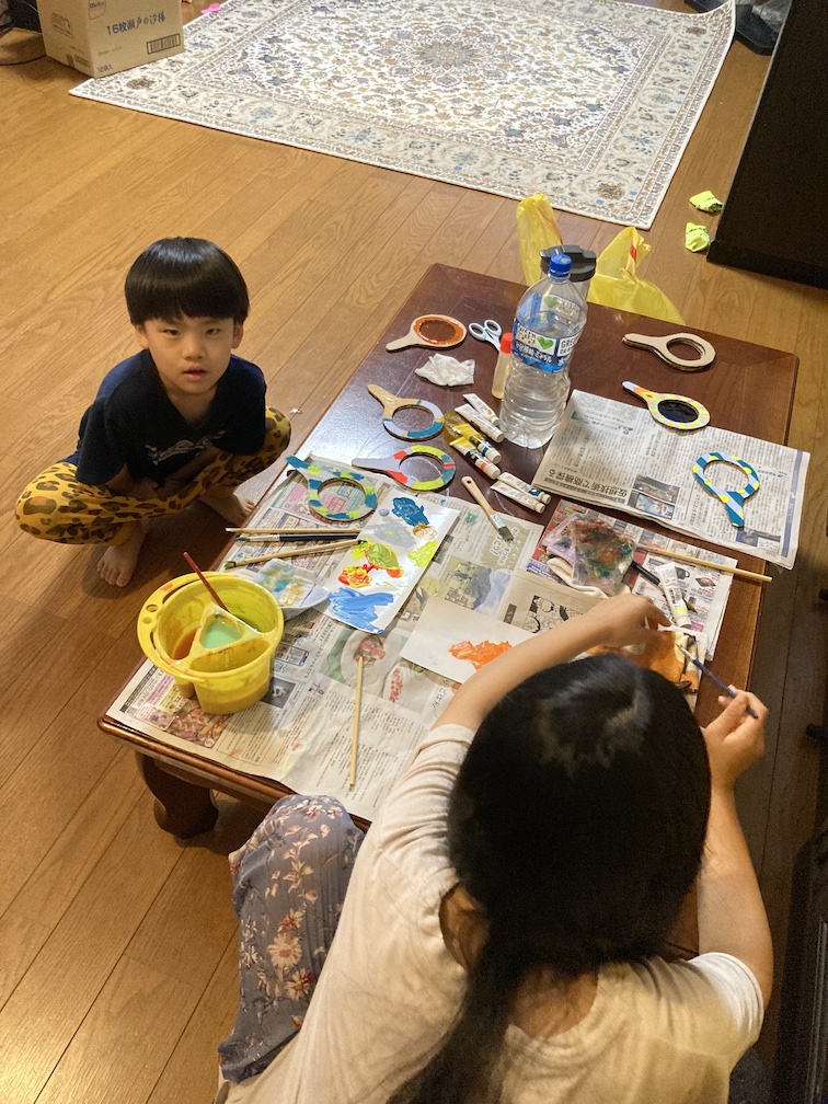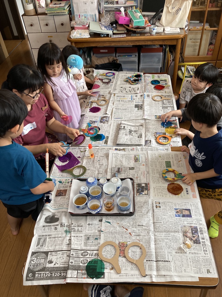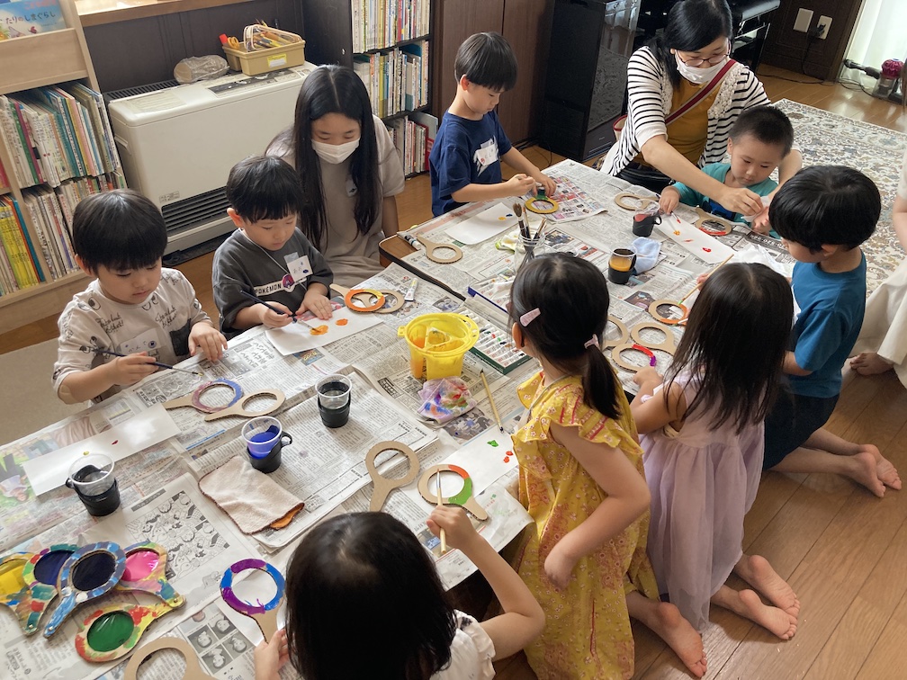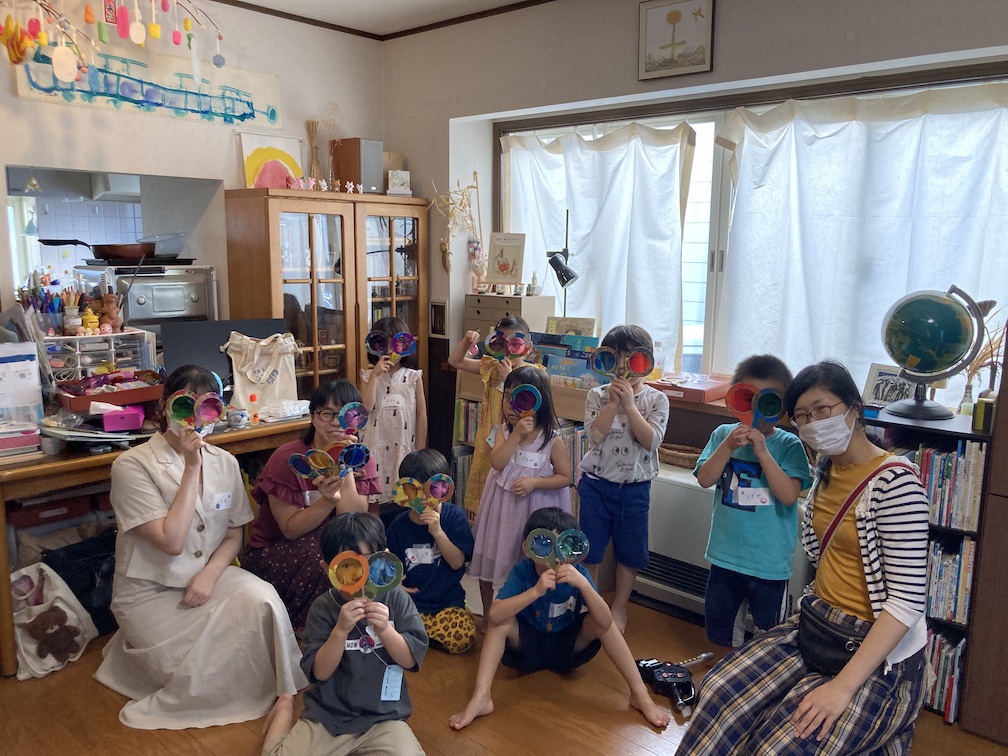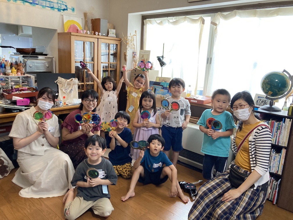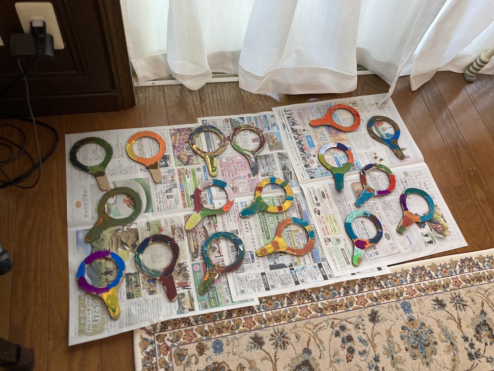この後は「トンボの虫めがね」づくりへ。先ほどのりむさんと一緒に切り抜いて予め作っておいた虫めがね型のダンボールに、アクリル絵の具で好きな絵柄を描きます。一人一人に紙パレットを渡すと、好きな絵の具を選び、楽しそうに塗り始めていました。絵ができたら乾燥させ、その後2色のカラーセロファンを丸く切ったものをのりで貼って、仕上げにリベットで留めて完成!!2色のセロファンで色を重ねて光を見てみたり、他のめがねをいくつも重ねて「まっくろになった〜」と言いながら遊ぶ子ども達。たのしく遊べるトンボの虫めがねが無事できてよかったです!