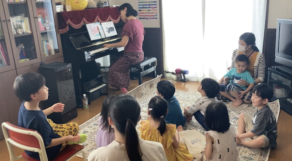 とんぼのめがね、きらきらぼしの歌から会はスタート!子ども達は、ピアノの周りに集まって歌ってくれました。その声のかわいらしいこと。自分も小さい頃よく歌っていましたが、童謡はいいもんだなぁと思います。たとえば「ふるさと」。「うさぎおいしかのやま、、、」耳から入った歌詞をそのまま歌うので、兎を追ったことも小鮒を釣った事もない私にとって正直よくわからない部分も多いのですが、昔の人が体験し歌にしたその心象風景が、歌を通して体にすっとストレートに入ってくるような感じがするのです。「とんぼのめがね」もくりかえしのメロディ・歌詞の中に、「みずいろ」「青いお空」「ぴかぴか」「おてんとさま」「あかいろ」「夕焼け雲」と変化をつけ、とんぼになったような気分で空を飛ぶ。歌にのって想像が広がる心地が、子どもの心にとっては何とも良い気がします。そんなこんなで、ピアノの伴奏が下手なのは棚に上げつつ、今後もいろいろな歌を楽しみたいなと思います。