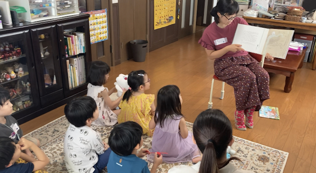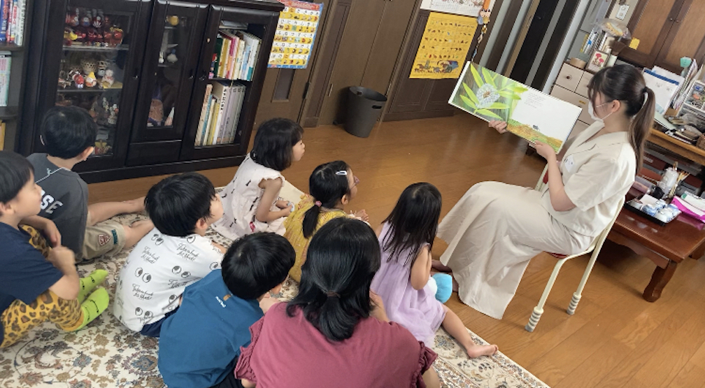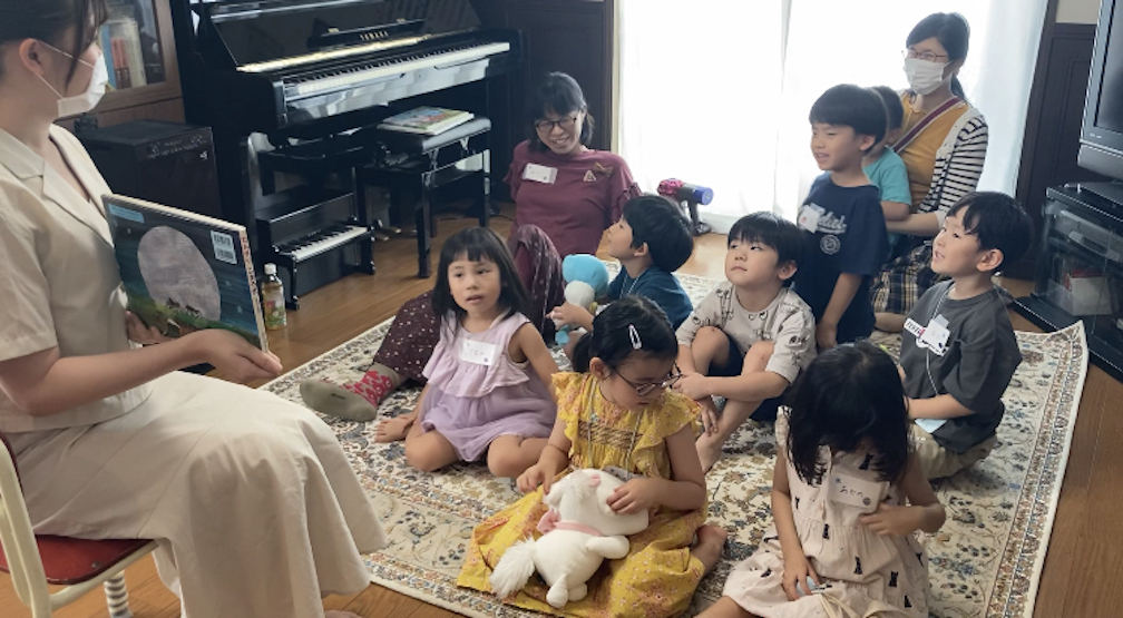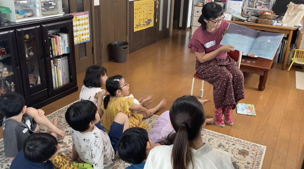 続いて、読み聞かせの時間。最初に来月、保育園実習を控えた大学2年生のりむさんが『だんまりこおろぎ』を読んでくれました。「こおろぎってどんな声かわかるかな〜?」と語りかけながら、「この本をね、よーく耳を澄ませて聞いたら、聞こえてくるかも…」と言って読み始めました。「はらぺこあおむし」の作者で知られるエリック・カールさんの本。登場してくる虫達が色鮮やかで個性的、どれもそれぞれにいいなと思いました。最後のページで(これはネタバレです)こおろぎの鳴き声が本から聞こえてきます。明かりに反応するセンサーで、ページを開くと鳴き声が流れるという装置付きだったのです。このしかけには、子ども達も自然と笑顔に!りむさんも前回(6月にも読み聞かせしてくれました)よりも子ども達が集中してお話を聞いてくれて嬉しかったとおっしゃっていました。10月から保育園実習が始まるとのことで、その前に読み聞かせを練習したいと、天良文庫に参加してくださったことが嬉しかったです。ぜひ頑張って欲しいです!
