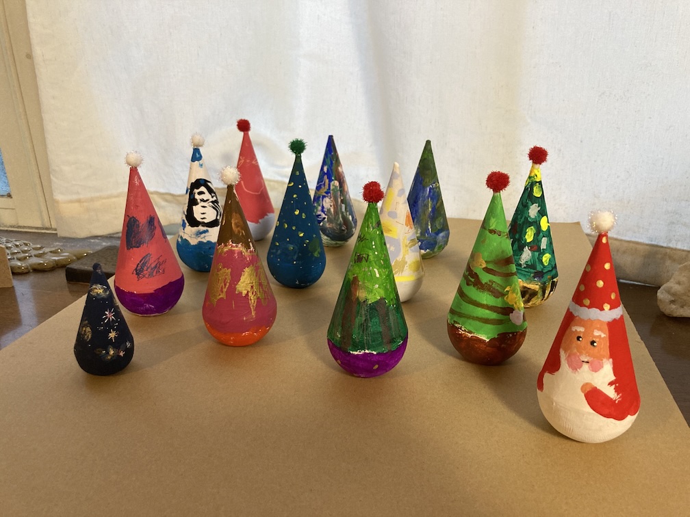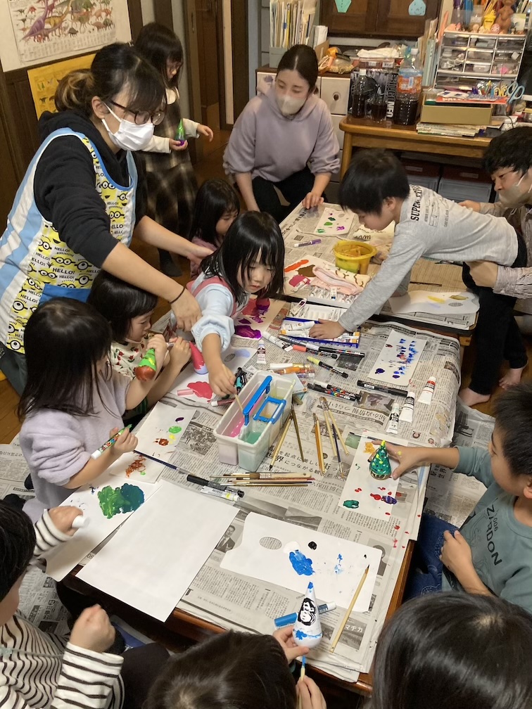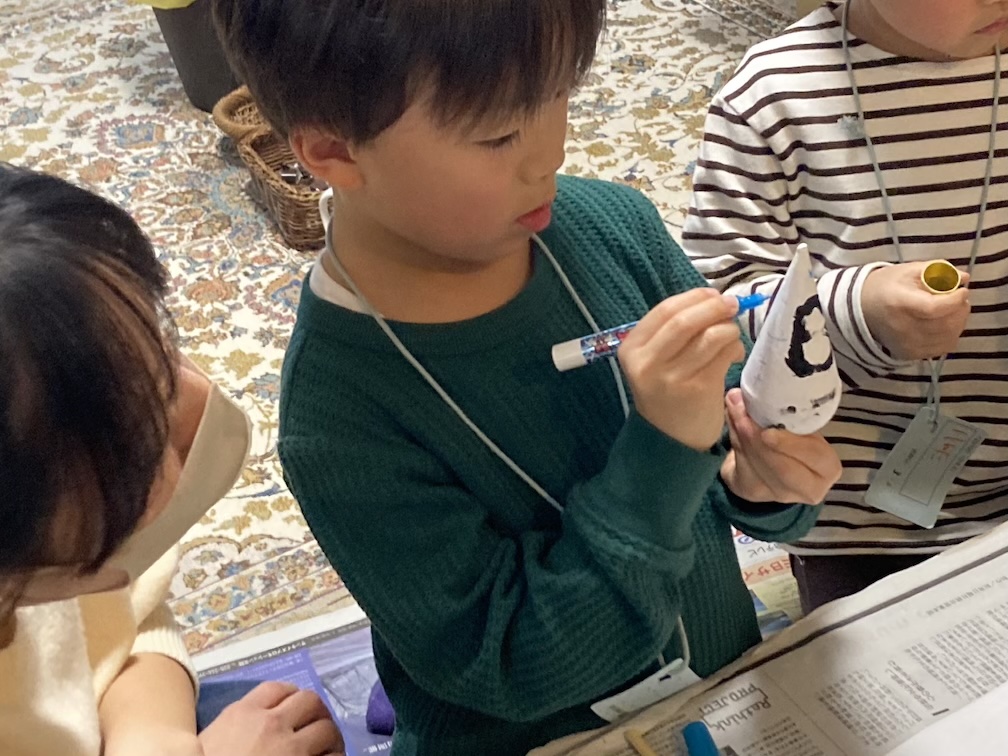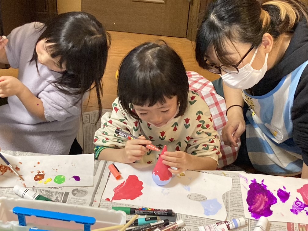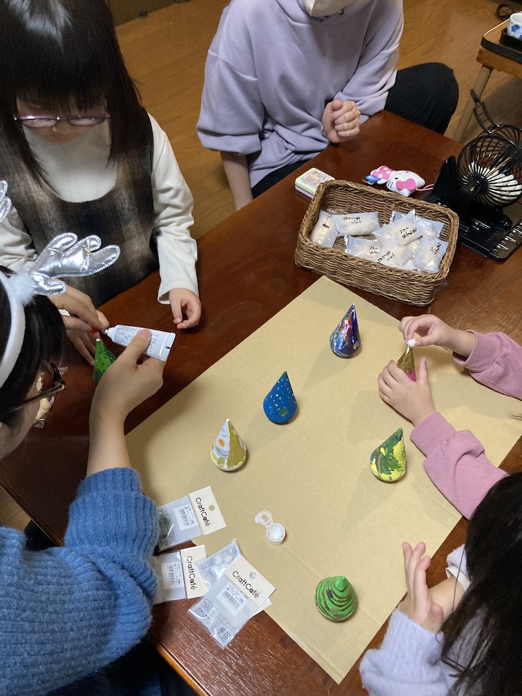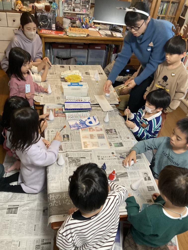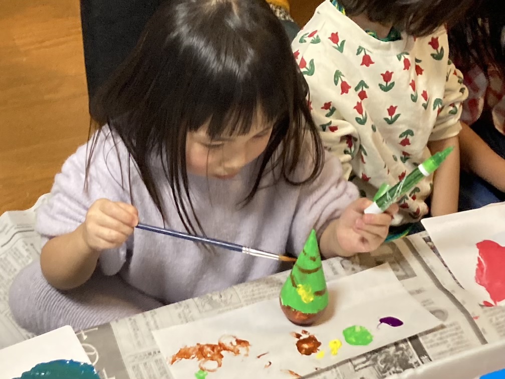 その後はおやつ休憩をとりつつ、「三角だるまの絵付け」パート2を再開! クリスマスツリーやサンタさん、雪だるまをモチーフにこだわりを持って描く子もいれば、アートっぽいランダム模様を大胆に描く子がいたり、それぞれ愛らしい感じに塗られていました。案外子ども達の絵付けスピードが速く、再び乾かしている間に予定(毎回予定通りはいかない!)より30分も早く「ビンゴ大会」をやることに。
