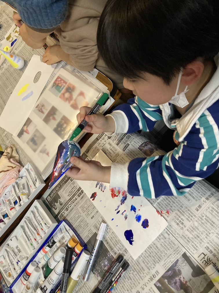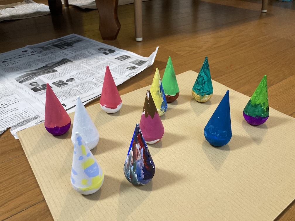 みんなの個性が光る素敵な作品ができあがり、帰り際に大事そうに、また嬉しそうに作品を親御さんに見せる様子が見られ、私も自然と笑顔になれました。一つ心残りだったのは、いつもの「つくった作品と一緒に皆で記念撮影!」を忘れてしまったこと。でも、作品の集合写真がその代わりになったので良しとします。筆を洗ったり、ビンゴの手伝いなど、ご参加くださったお母さん方にはいろいろとご協力いただきました。ありがとうございました!