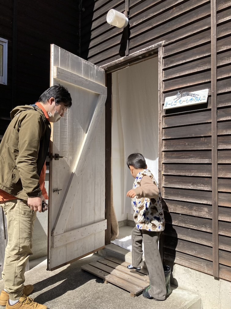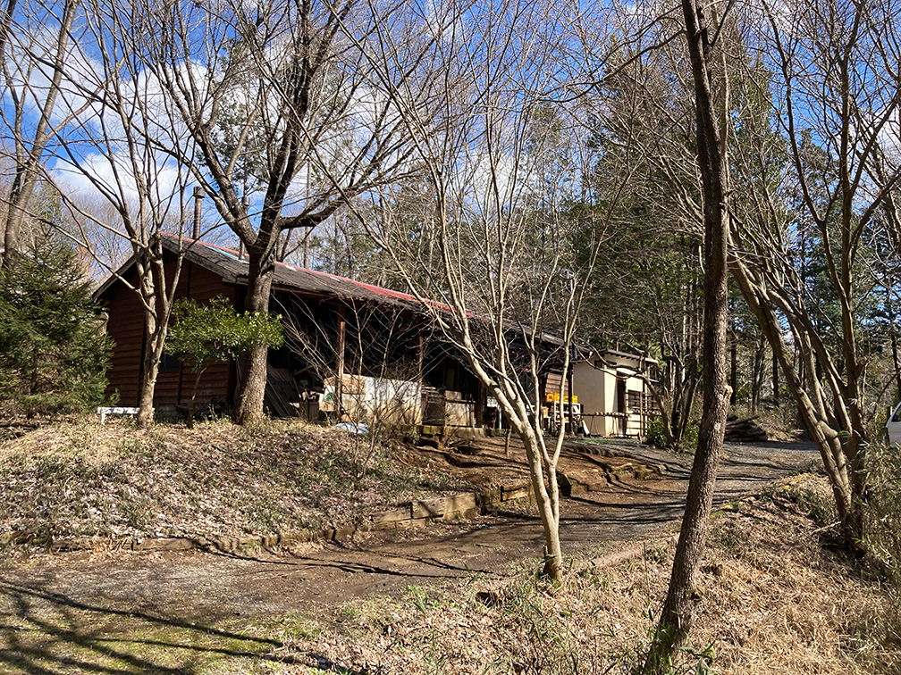清々しく晴れたお天気の中、山間の木々の中から山小屋風の建物が見え、敷地の入り口にちいさく文庫の名前が描かれた丸看板を発見し中へ入ると石川さんの旦那様で陶芸家の石川若彦さんが外でお仕事のまっ最中。窯で焼いたうつわの貫入(釉薬のヒビのような部分)にコーヒーを染み込ませるという作業をしていらっしゃいました。こちらも興味深かったのですが、「文庫はこらちですよ→」と教えてくださり、ちょうどそのタイミングで奥から石川綾子さんが出てこられ、「よくいらっしゃいました。どうぞ文庫へ」とご案内いただき、私、夫、息子の3人でお邪魔しました。