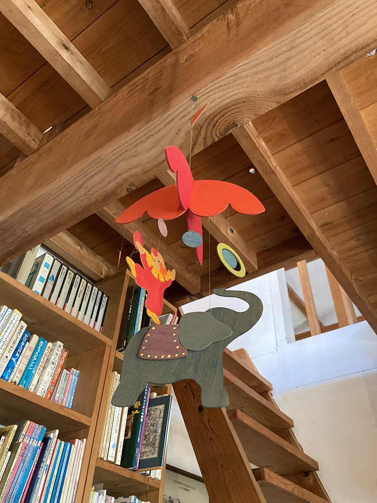 お部屋に入ると、「まあ、なんてかわいい空間!」と第一印象で思いました。うずたかく本棚には本が収められているのだけど、割合天井が高く抜けていて圧迫感なく、看板といい本棚といい、壁に飾ってある(文庫の)おたんじょうびボードや吊り下げらたモビールといい、手作りのものが沢山あって、あたたかな、ユーモアセンスも感じるような一部屋が広がっていました。一面の大きな窓からは日の光も差し込んでいました。