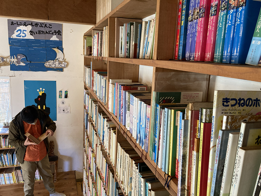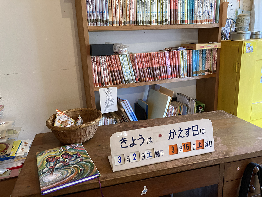 「ムーシカ文庫」(1965〜1988)の蔵書を引き受けることになり、それと同時に文庫で使われていた本棚や看板、図書カード、いろいろなものを引き継ぐことになった。もちろん本は古くなっていくので自分自身で、または伊藤忠記念財団の助成金も活用させてもらったりして新しく買い替えたり備品類も調達し、今管理している蔵書は五千冊以上になっている。本棚もほぼ自分たち(石川さんご夫婦)の手作り。