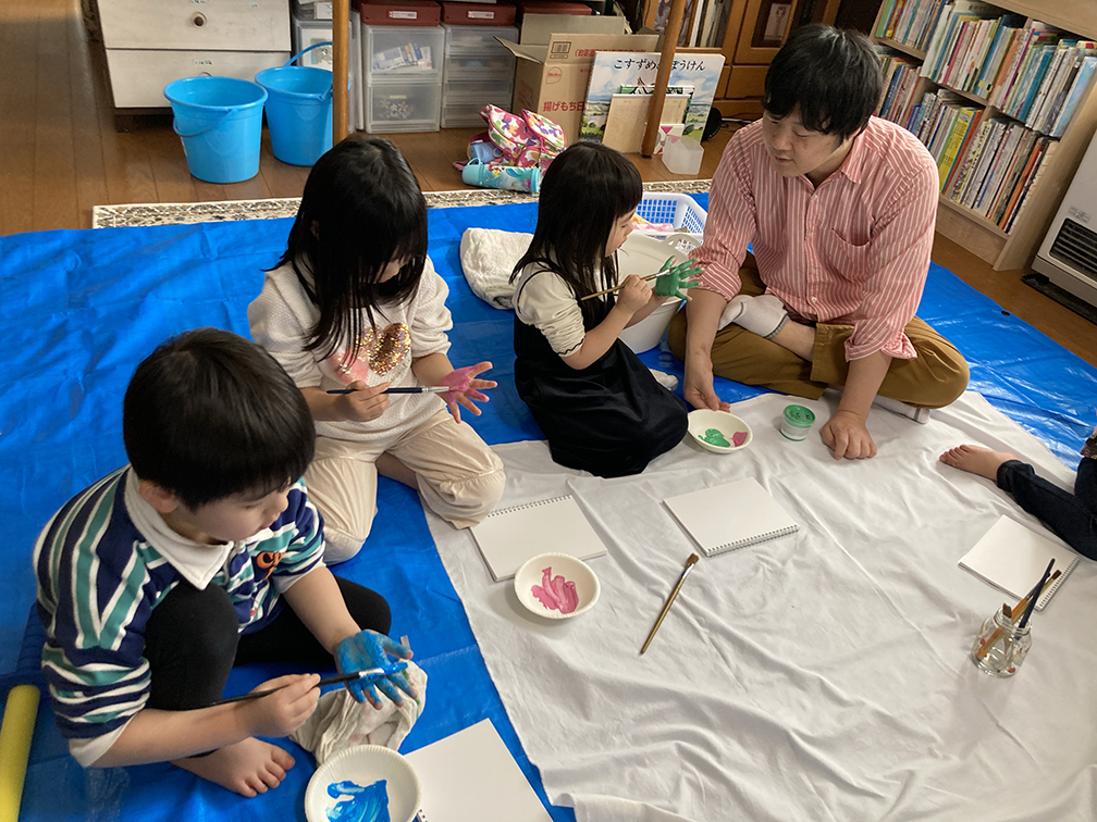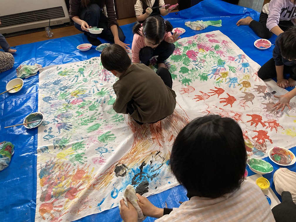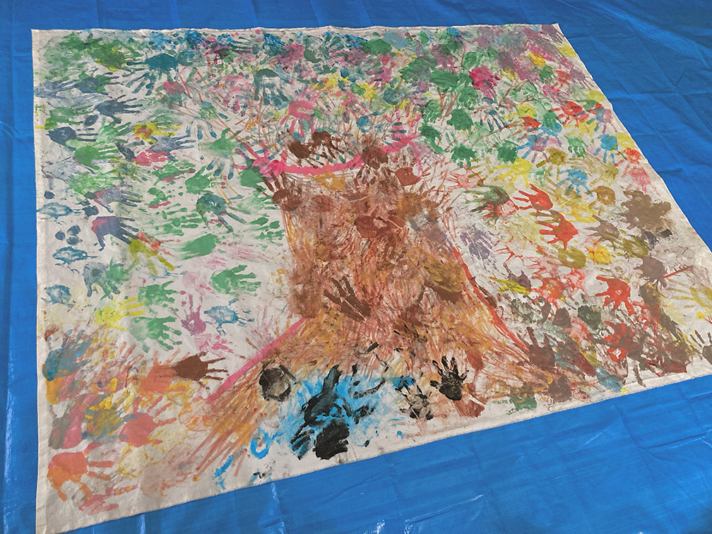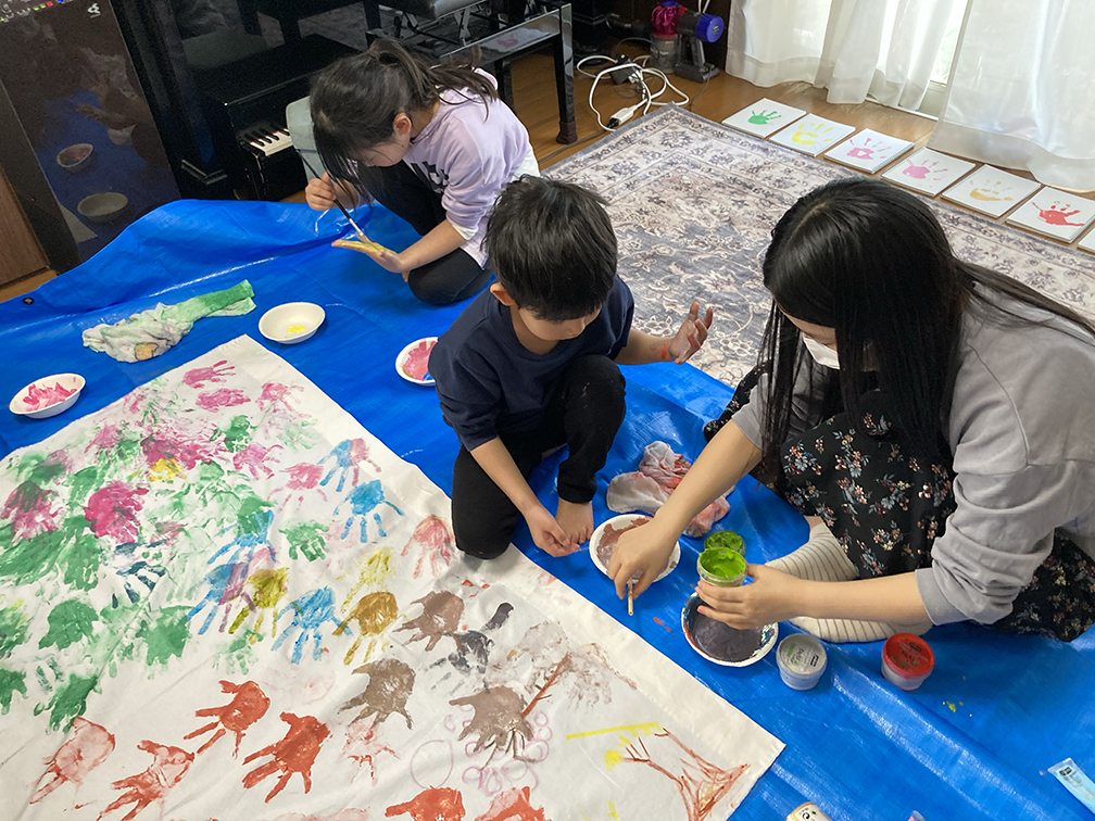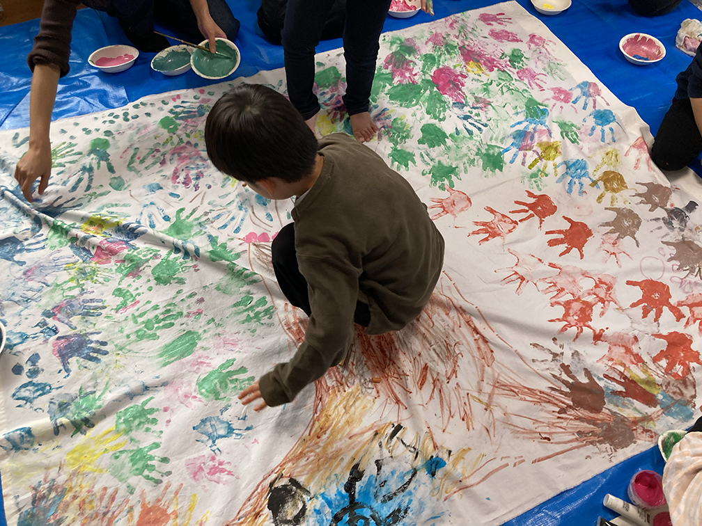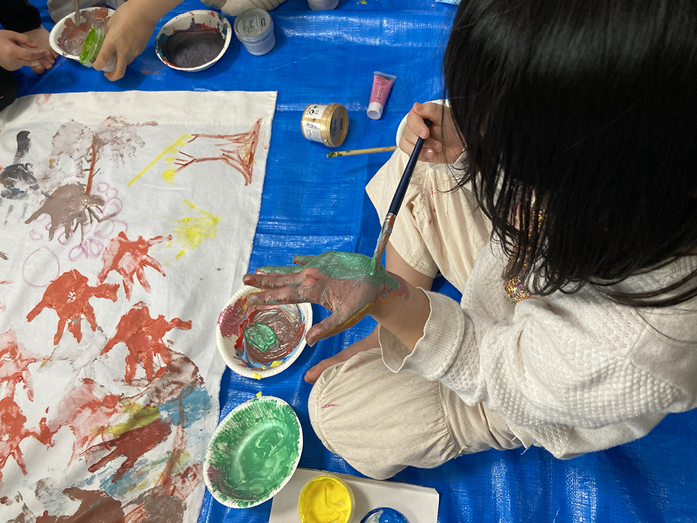 そして今回の山場、フィンガーペイントで「みんなの木」を描きました。これまでの活動では1人ずつ作品を作っていましたが、今回は「みんなで一つの作品をつくる」ということに挑戦!
