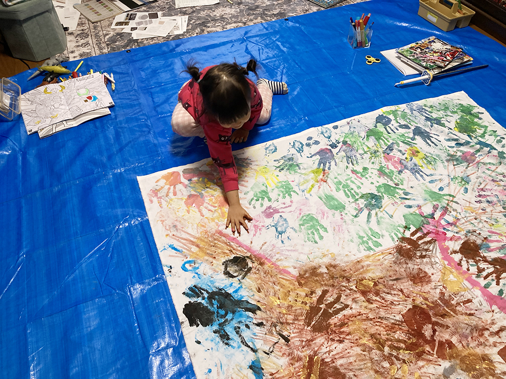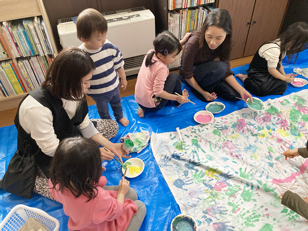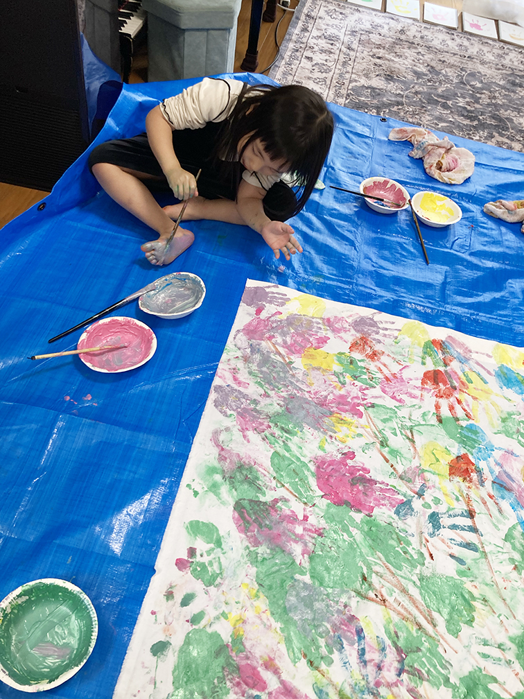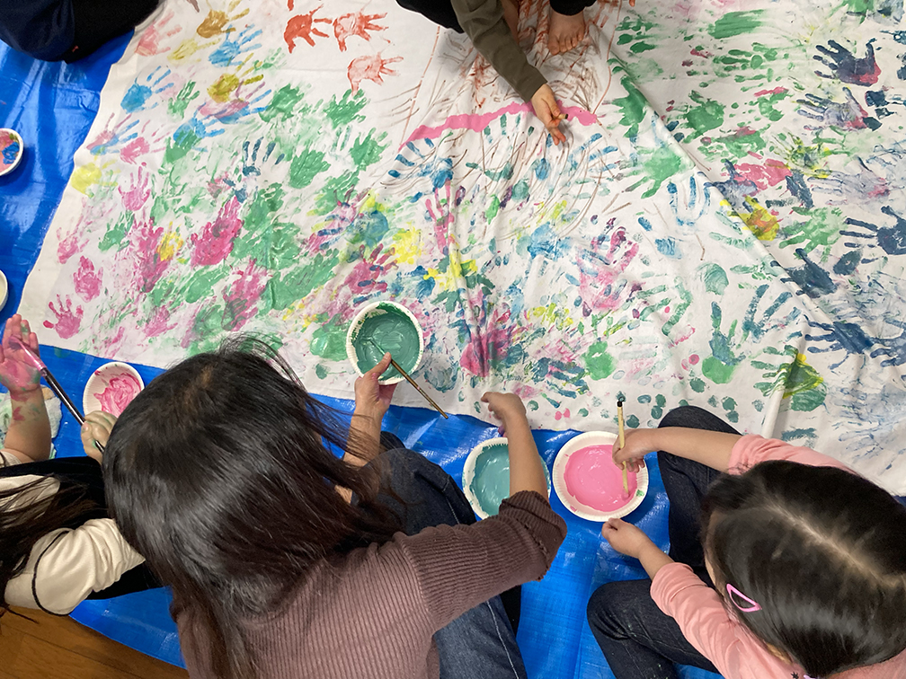 筆を使うのに慣れているのか、フィンガーペイント用の絵の具を手に塗って、それで直接布にぺたぺたやるんだよと言っても、その感触を気持ちわるがって、筆あるいはクレヨンを使う〜と言う子も中にはいたのですが、概ねみんな最後には大胆になってペタペタ、塗り塗りしていました!最後には、足にまで絵の具をつける子(我が子も)いて、よほど面白かったんだなぁと思いました。