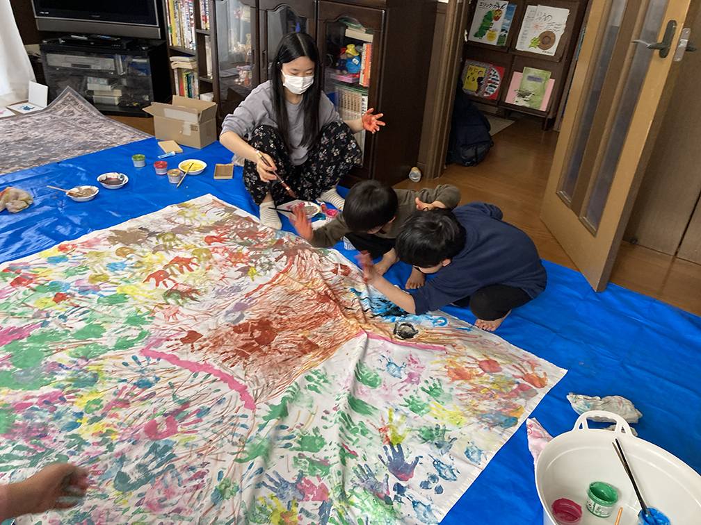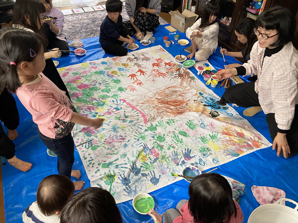 だんだんと絵ができていく過程が面白く、不思議と手が春・夏・秋・冬の色合いの葉っぱのように見えて、木の幹部分にはカブトムシのような手形もついたり、幹の下にある黒と水色(水たまりと生き物の影?のように見える)が効いていて、小一時間でとても表情に富んだ1枚の素敵な「みんなの木」が出来上がりました!ぴよぴよ文庫さんの絵本を並べる部屋に、作品「みんなの木」は飾ろうと思います。きっと次回以降、天良文庫で見られますので、お楽しみに🎵