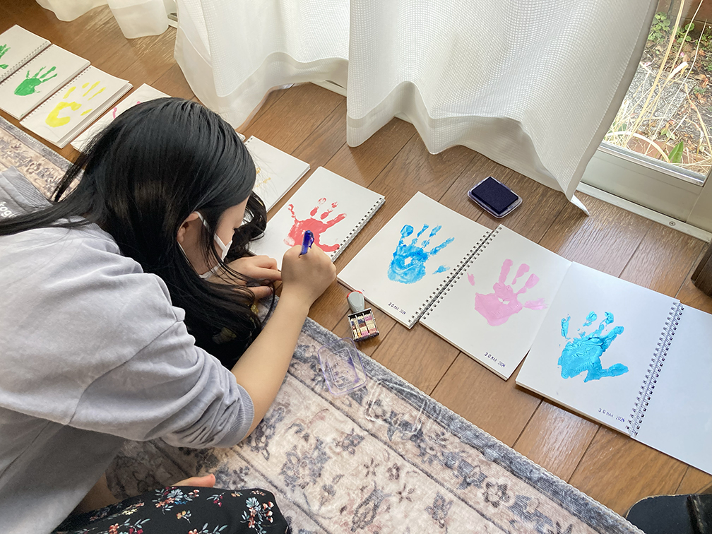 最初に1周年記念品として制作したスケッチブックに好きな色でそれぞれが記念の手形を押して、日付ハンコを娘が入れ、みんなの手形もいい感じで残せました!こちらは持ち帰りました。