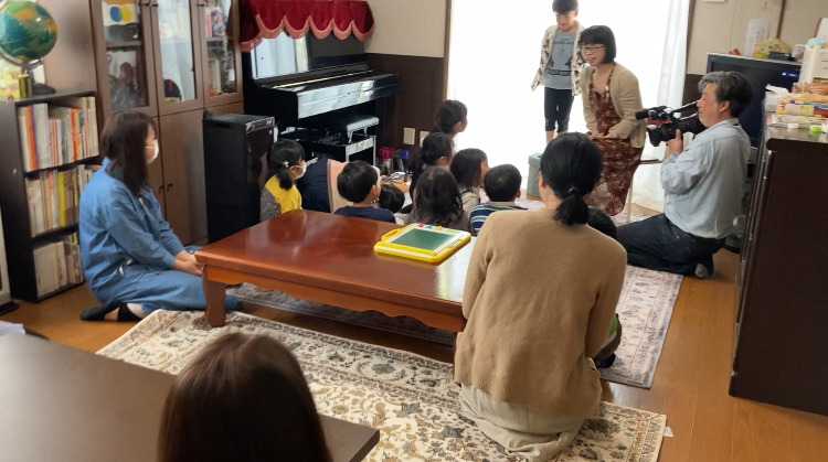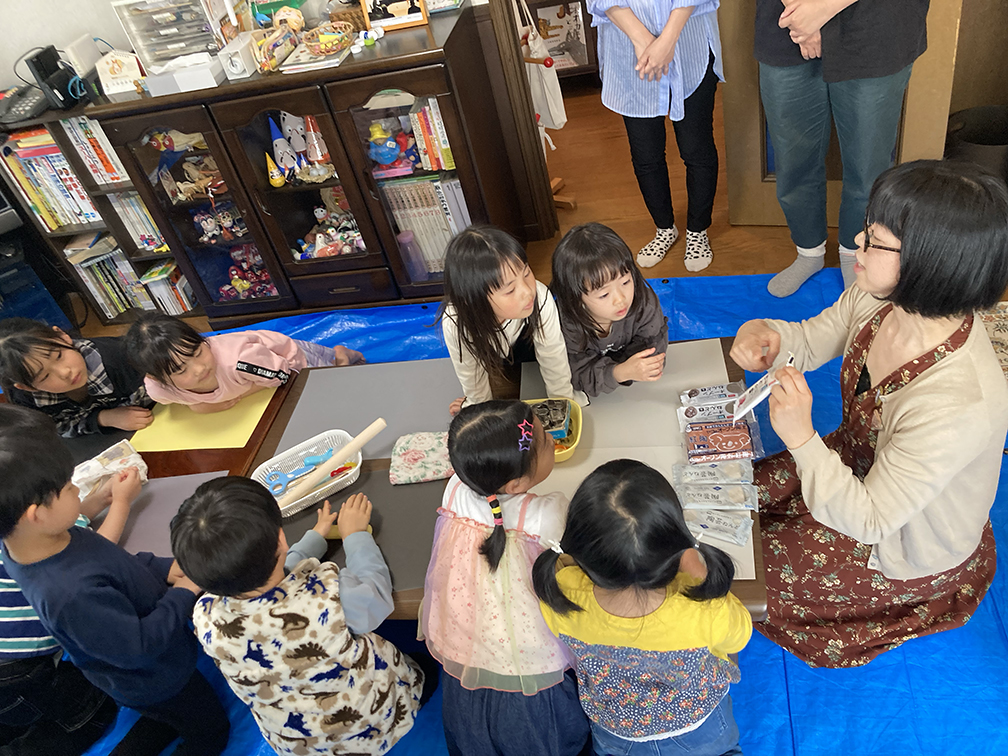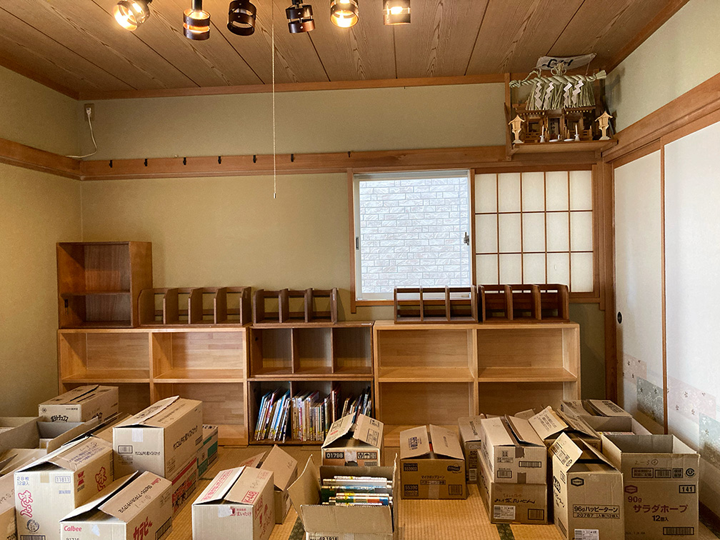 実はこのワークショップ、「ぴよぴよ文庫」があった牡丹山幼稚園の元園長・樋口泰子先生にもご参加をいただいておりました! 数日前に撮影が入るということが決まり、樋口先生に取材の件でご連絡すると、急きょ4月の会当日に天良文庫に来てくださることになったのです!先生には天良文庫での子ども達の様子を見ながら、まさに現場で絵本たちの行末に思いを馳せていただき、インタビューにお応えいただきました。そして子ども達に差し入れをいただいたり、箱を畳むお手伝いまでしていただきました。樋口先生、本当にありがとうございました!また遊びにいらしてください。