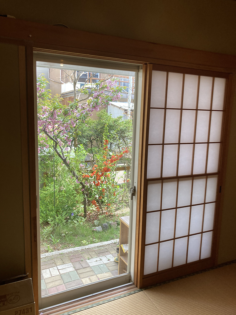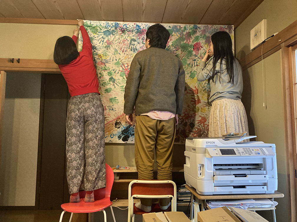 天良文庫の前日、3月の会の時にみんなで描いた「みんなの木」の布絵を1階和室の壁に展示しました!私、夫、娘の三人がかりでやっていたその作業中、息子が面白い写真を撮影してましたのでおまけに。三人とも同じ姿勢(笑)↓