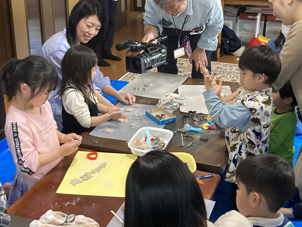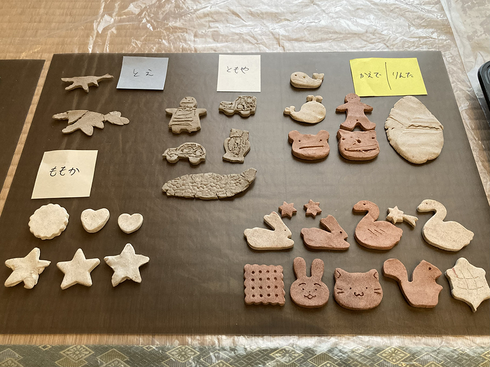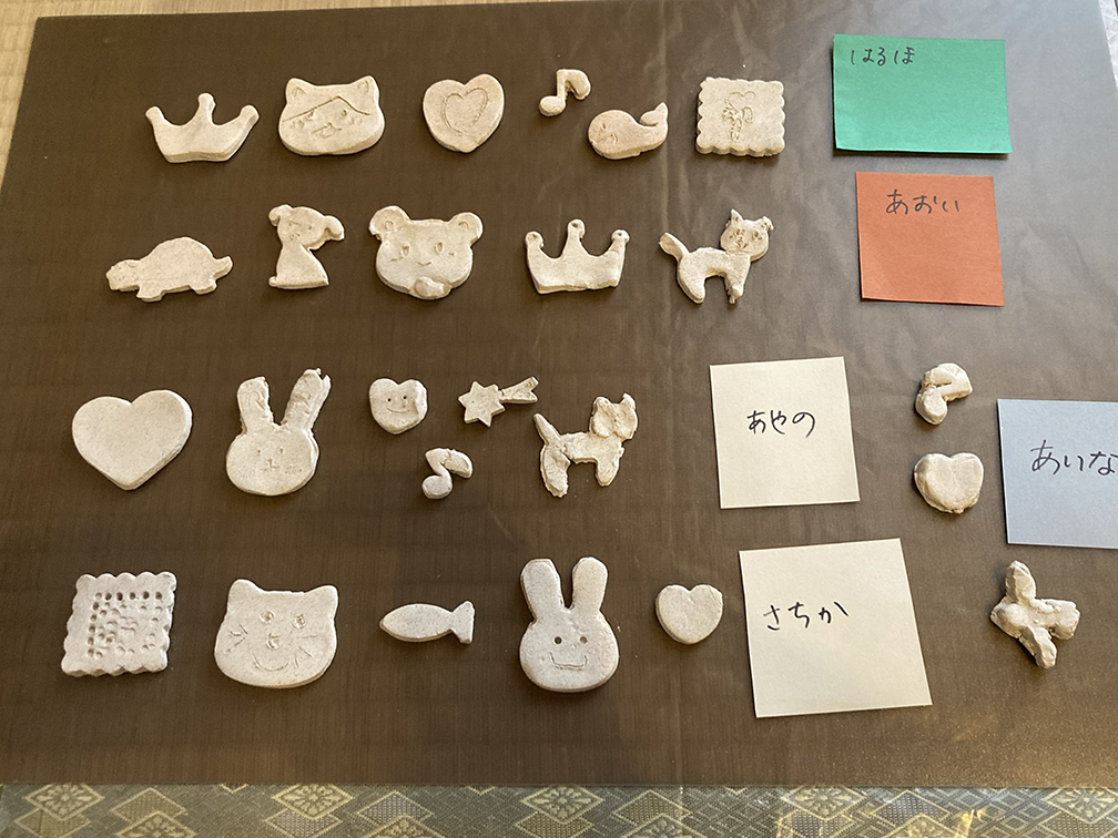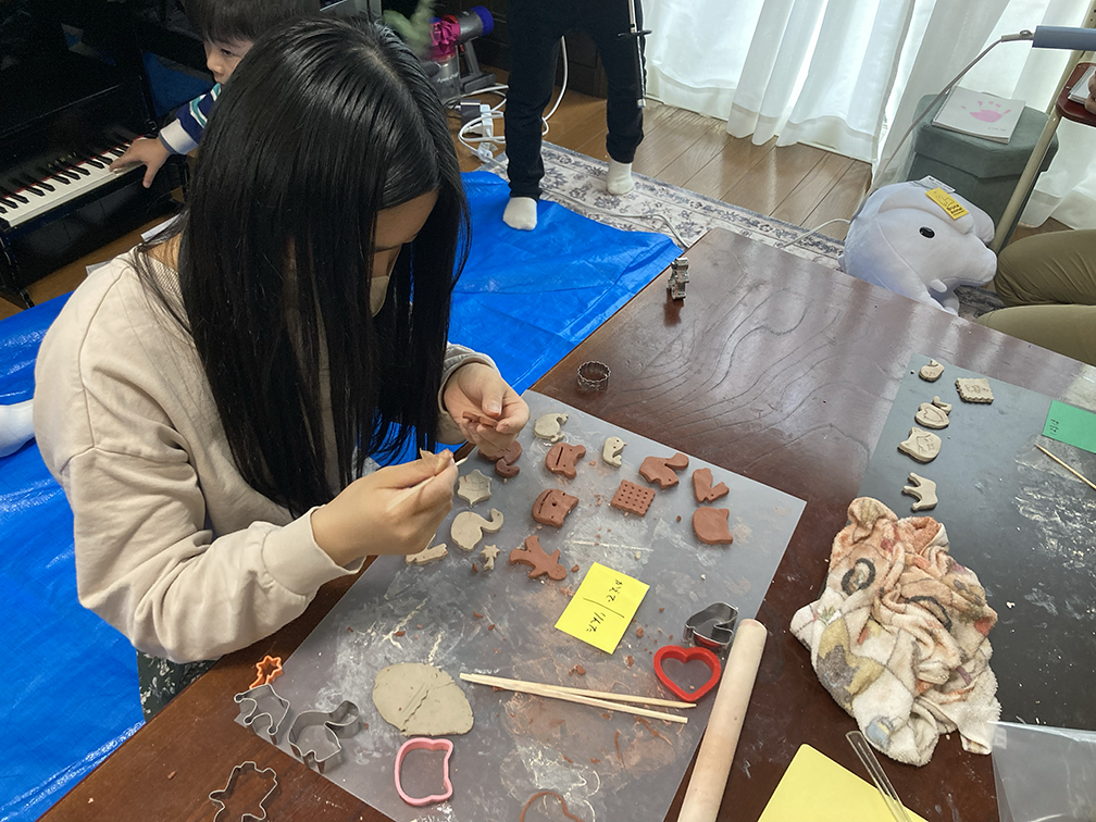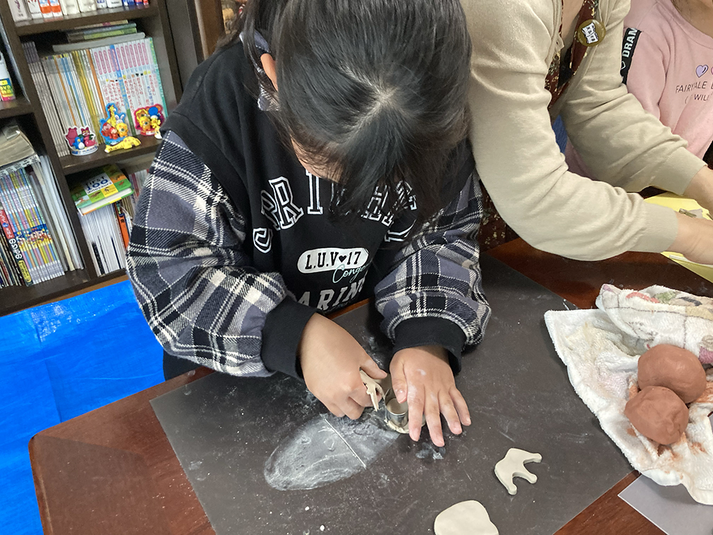 読み聞かせが終わると今度は、オーブン粘土あそびです!子ども達、粘土いじりが好きな子が多いのでしょうか、夢中で粘土を好きな型で抜いたり、竹串で顔や模様をつけたりを楽しんでいました。オーブン粘土はその名の通り、オーブンで焼き固めることのできる粘土。固まると焼き物のようになり、コート剤を使えば、さらに強く仕上がります。今日はオーブンに入れる前の成形までの工程をやりました。