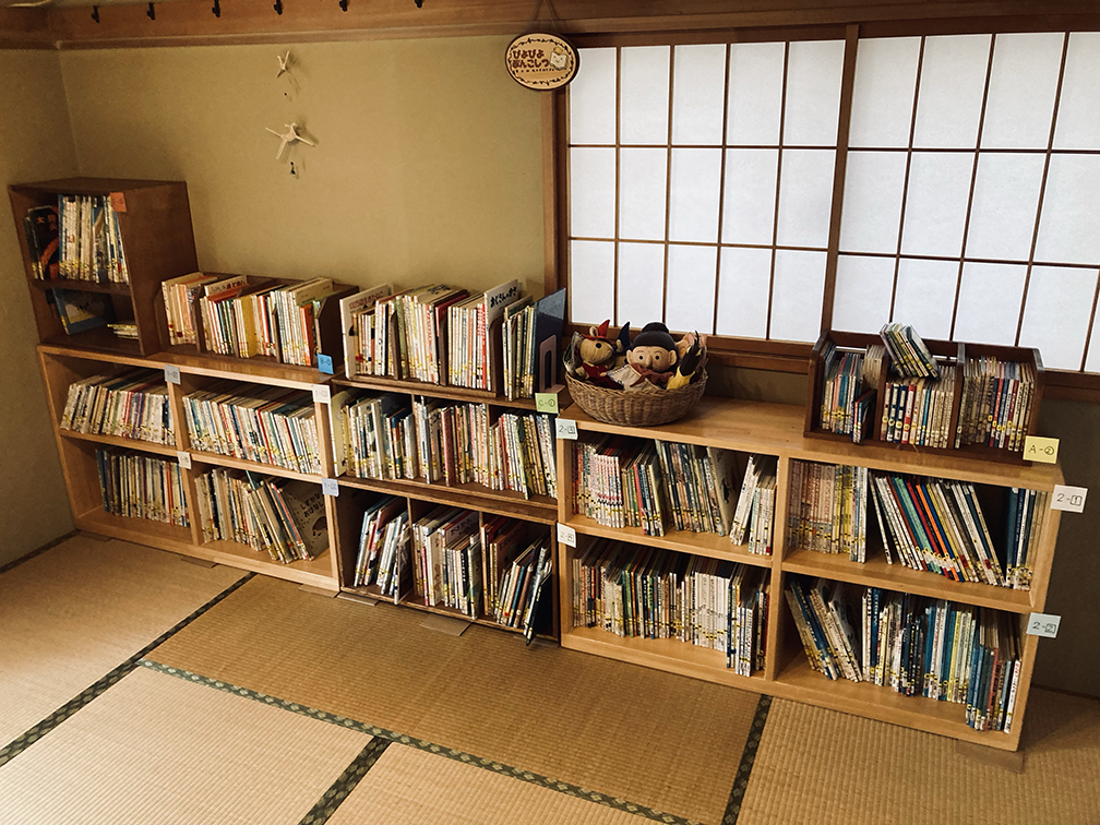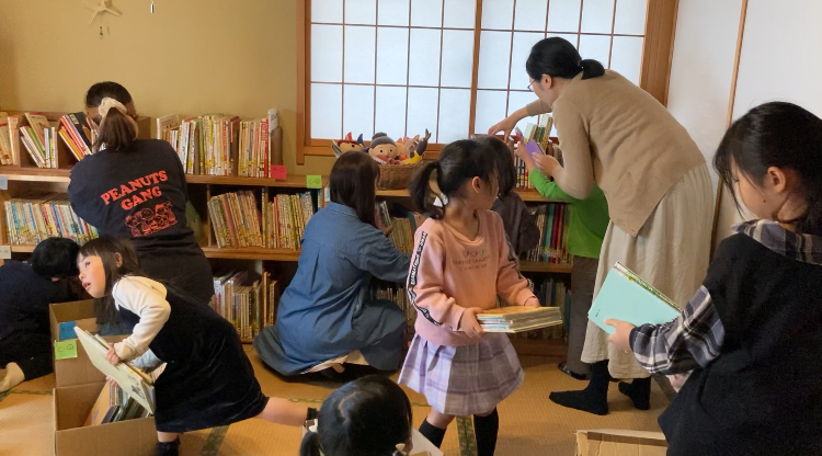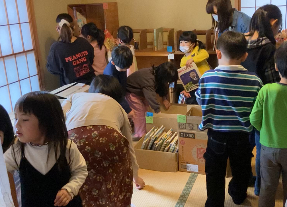 続いて、いつもなら読み聞かせですが、今回は取材の目玉でもあった「ぴよぴよ文庫」さんの絵本をダンボール箱から出し、子ども達の手で本棚に並べるという〝絵本並べワークショップ〟をやりました。これからいっぱい活躍してくれるだろう1000冊を超える絵本たち。それを自分の手で並べることで、こんなにあるんだとか、この絵本面白そう、読んでもらいたいなどと、子ども達自ら絵本に意識を向けてもらえたらと思ったので、このようなワークショップを思いつきました。