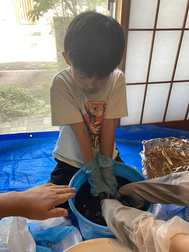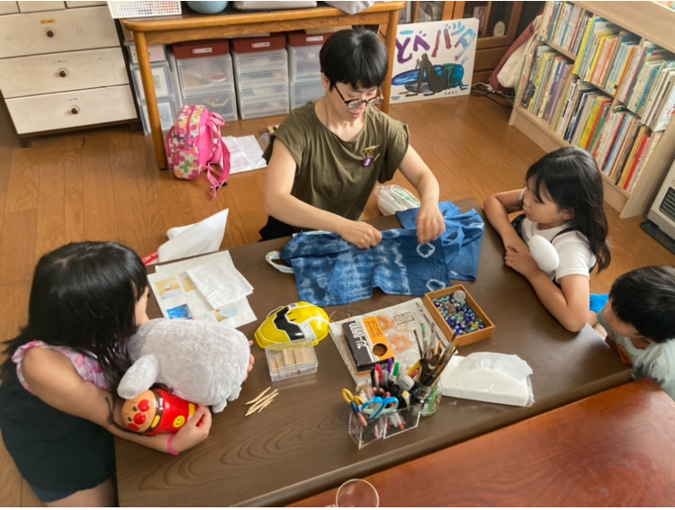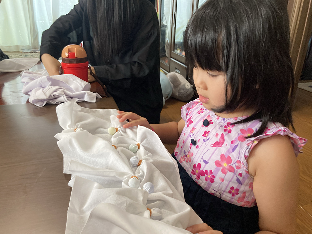 そして、いよいよリベンジ・絞り染めの時間!前回よりもスムーズに、子ども達と絞り作業をやることができました。小学生のお姉さんはもちろんのこと、6歳児たちが輪ゴムでビー玉をとめるのが結構上手で、また模様の位置決めなどもこだわりを持ってやっていて、小さなことだけど成長を感じました。「ああ、いま〝遊び〟中心のこの子たちは、もう来年には小学生なのかぁ」と感慨深く…その〝遊び〟をもっと継続させてあげられるよう、天良文庫でできることは何だろうなと思いました。そうこう考えるうち、毎回ぱっとアイデアが湧いて出てくるので、「文庫活動は楽しい」しかないです!