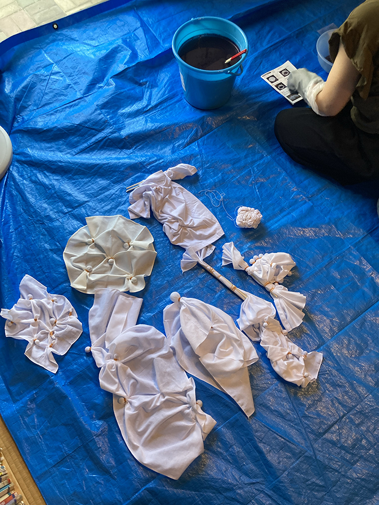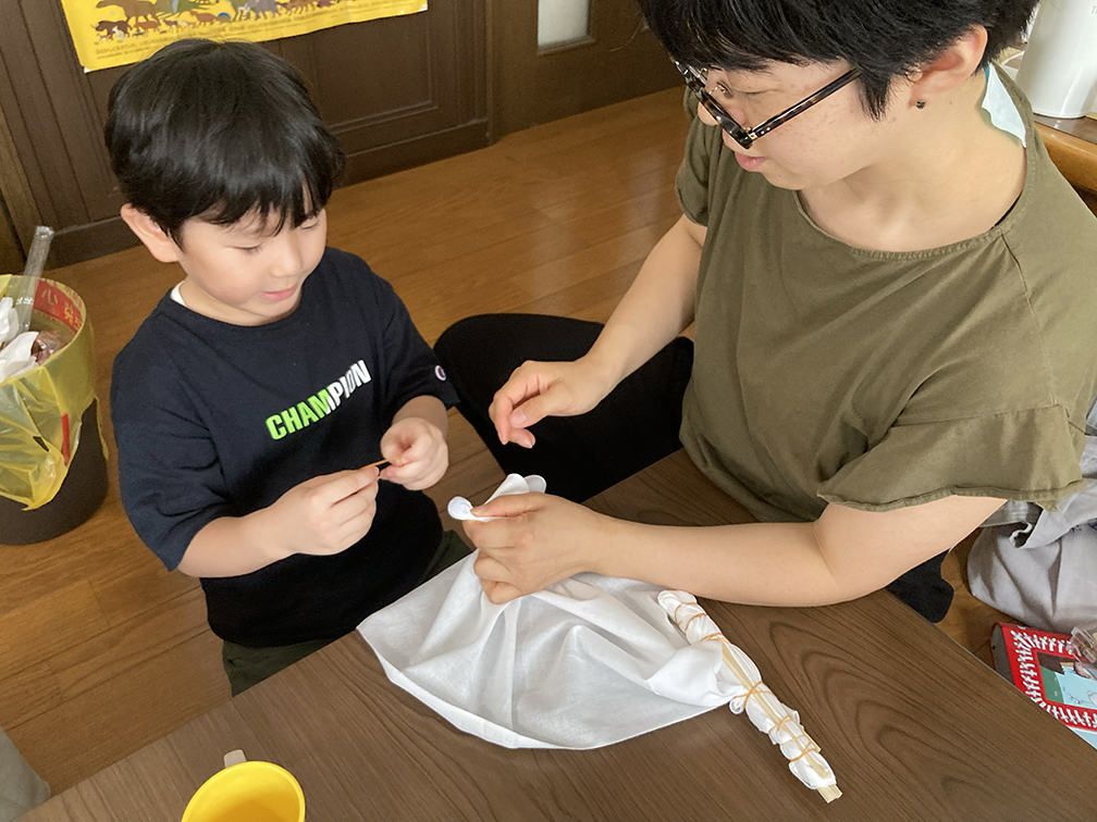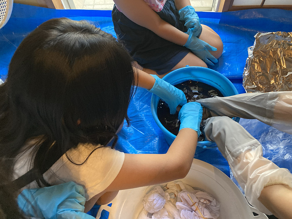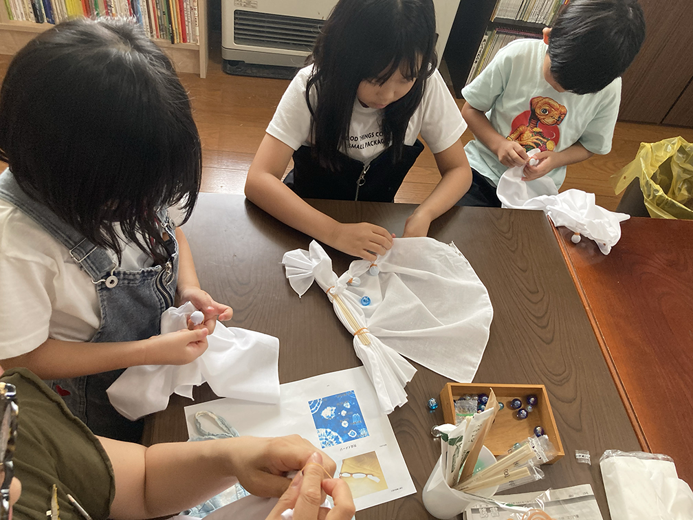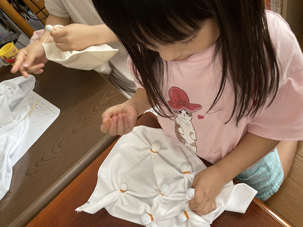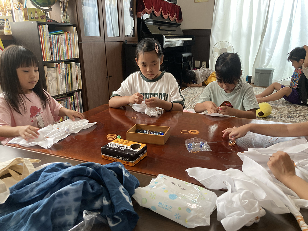 夏らしい空気の絵本をいっぱい読んで、次にとりかかったのは「藍染めのてぬぐい絞り染め」体験。子ども達はみな「絞り」は初体験でした。ビー玉や輪ゴム、割り箸、紐を使っていろいろな模様が出るように工夫しました。模様の作り方は本当に人それぞれで見ていて楽しかったです!