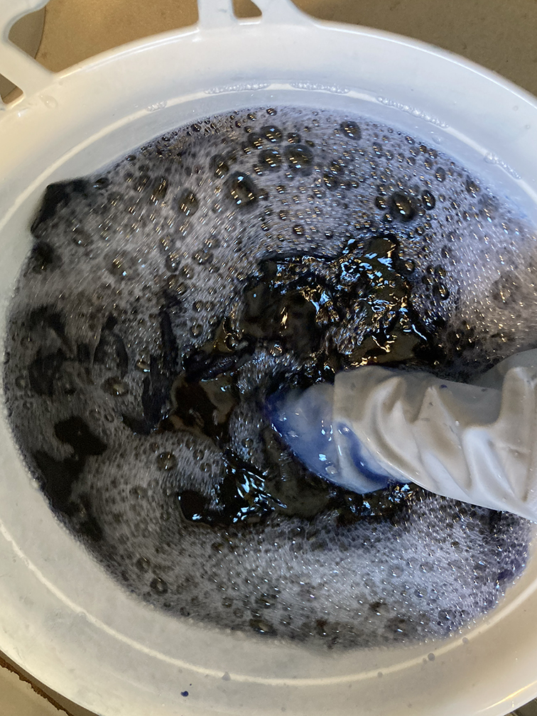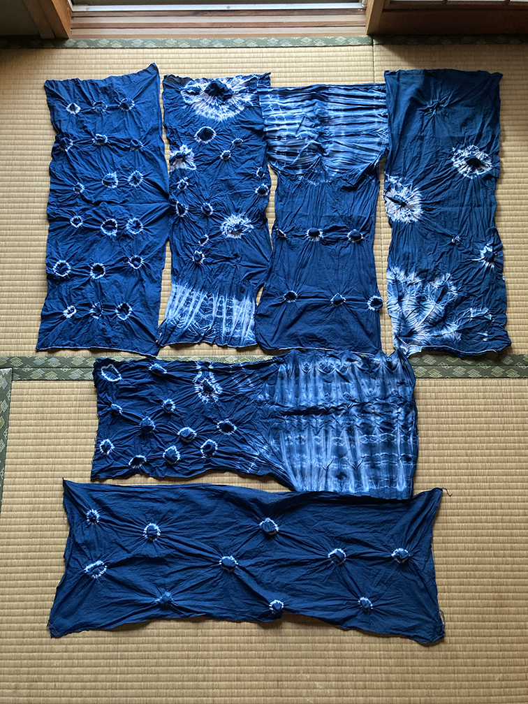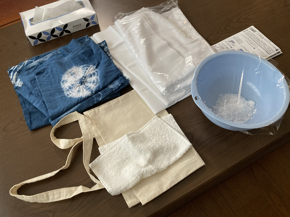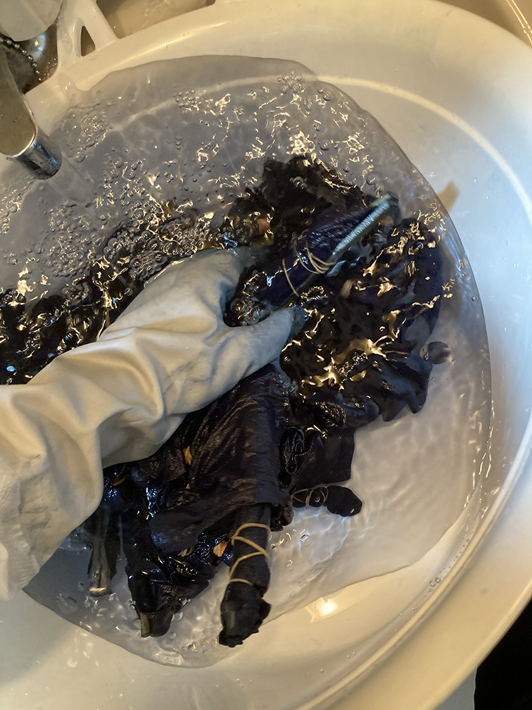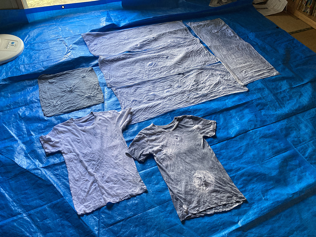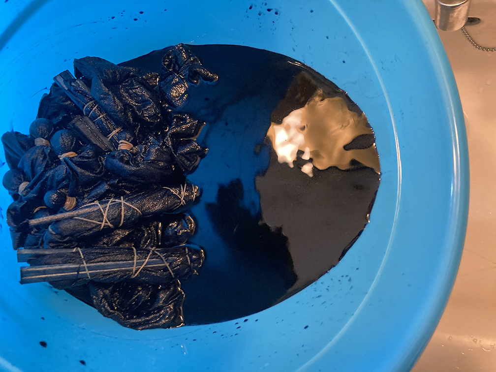 染料は今回ネイビーブルーの人工染料(「みやこ染」製)を使用しました。試しでやった時よりも水温を高めにして、かつ少し長く浸けたので、より濃く染まった気がします。翌日には乾いて、無事お渡しすることができました!!
