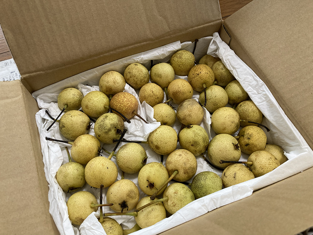 最初は昔話の『やまなしもぎ』を読んだのですが、、、実はこの日の朝、岩手県盛岡市からとある果物が届きました。「イワテヤマナシ」(梨の野生種)です! 来月の天良文庫で朗読する宮沢賢治の『やまなし』に登場する薫り高い梨で知られるもの。その薫りが実際にどんなものか知りたくて、どうにか手に入らないかと調べたところ、元神戸大学の先生で「イワテヤマナシ」について研究、今は就農され故郷の盛岡でその生産をなさっているという片山寛則さんをYoutubeで知りました。Instagramでメッセージをお送りしたら、「まさに今が一番、ヤマナシの香りの旬です」ということで、早速2kg購入させてもらい冷蔵便で送っていただき、文庫の日当日に届いた!というわけです(ナイスタイミング!!)。10月の天良文庫は天良の命日前夜ということで特別な会を催しますので、そのお知らせは追ってまた。その際シロップかジャムの形でヤマナシを試食してもらおうと考え中なので、どうぞお楽しみに!