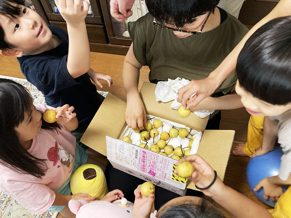 すっかりヤマナシで盛り上がってしまいましたが、試食後に『やまなしもぎ』を読みました。3兄弟がでてきて、昔話によくある1、2番目の兄は失敗するけど、3番目の弟が(やまなしもぎに)成功し、最後には家族みなが幸せに暮らしたというお話。絵がなかなか風情のある良い本でした。子ども達もヤマナシの香りとともに印象に残ったかな。