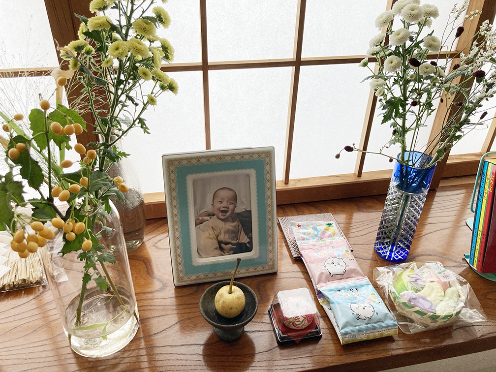 最後は記念撮影!!我が家のいろんな場所で撮影している気がします。ここは2階の天良の仏壇のある「そらくん部屋」。写ってはいないけど、いつもここには天良が居るなと思って写真を撮っています。ちょうど撮る時、隣りに天良の仏壇があって、男の子が天良の写真に向かって「天良くん、いま元気かな」って呟いていたので、「元気だよ、きっと。天国では2歳になっているよ」って応えました。こんなふうに気にしてもらえる人が一人でもいると、天良は嬉しいんじゃないかな。
