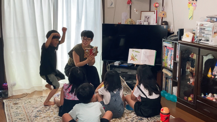 工藤直子さんの『のはらうたⅠ』から「おれはかまきり」を読むことから始まったのですが、子ども達から「おもしろい!!」との第一声!〝かまきりりゅうじ〟になりきって読むこちらにも熱が入り、2回読みました。この詩、やっぱり子どもにもウケがいいです。つづいて田島征三さんの『とべバッタ』を大型絵本で。せっかくなので、江南区横越のご自宅で読み聞かせや昔話など「石塚さん家のおはなし会」を長く開いていらっしゃり、今でもおはなし会に出張なさるベテラン石塚さんに読み手をバトンタッチ。千加子さんの声が心地よく耳に残り、すてきな読み聞かせでした。もともと絵に迫力のある作品ですが、大型絵本になってさらにバッタがすごい勢いで飛んでいく光景が目に飛び込んできて、「この絵(蜘蛛と巣がめちゃめちゃ)がこわーい!」とか、荒地をこえ海をこえてはるかへ飛んで行ったシーンでは「たぶん北海道までいったよ」とつぶやく子も(笑)子どもの目には絵本の画の奥に、想像という広がりの画面があるのかなとふと思いました。私も文庫の活動を通じてそんな奥行きを取り戻せたらなぁ、と密かに思っています。