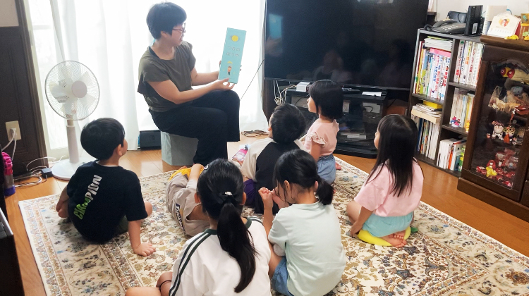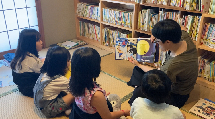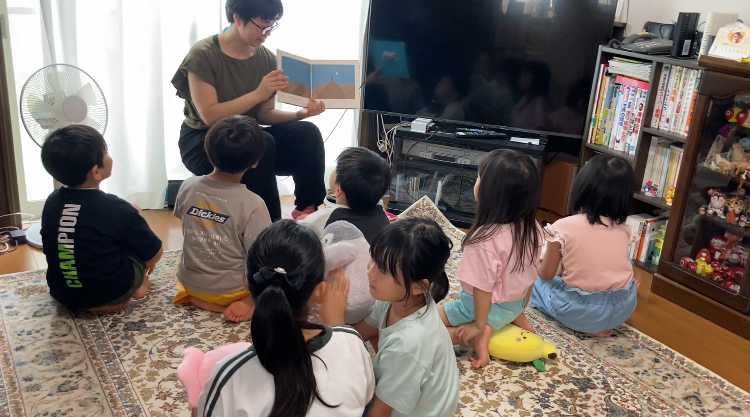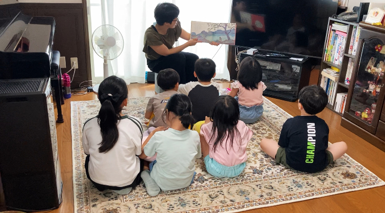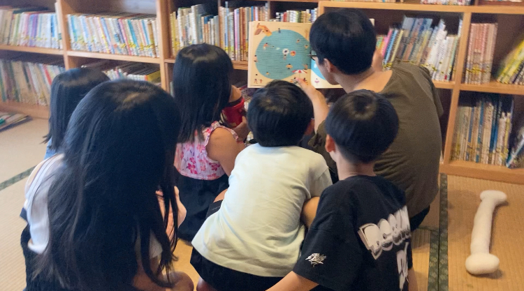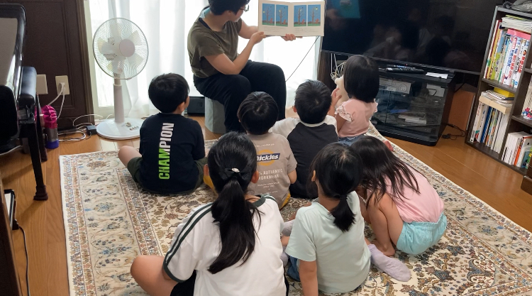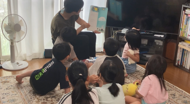 その後、おつきさまが出てくる『ぼく、お月さまとはなしたよ』『つきのぼうや』を読み、こちらはそれぞれにオチがあって面白い絵本でした。前者は「やまびこ」(の言葉というより現象)がでてくるのですが、「山で『やっほー』というと、『やっほー』って返ってくることをやまびこっていうの知ってる?」と尋ねてみると、「知ってる!私ショート動画でみたことある」と教えてくれた女の子。時代だなと思いました。私自身もやまびこは体験したことはありませんが、動画でこういう知識を得るんですね。「じゃあ、ほんとうはお月さまが言ったんじゃないじゃん」とか「ぼくも(全部おんなじこと言ってるって)気になったよ」と感想を言っていてかわいらしかったです。最後の『つきのぼうや』は、子ども達の集中が切れてきた感じがしたので、急ぎめに読みました。毎回思いますが、このあたりのさじ加減がなかなか難しい。やはり年長さんが多い文庫のメンバーは、以前よりもお話を長く聞ける子が増えてきた印象ですが、お話だけで興味を引っぱるにはバランスも必要だなと思います。最後は軽く聞き流せるような絵本でもよかったかなと思いました。でも『つきのぼうや』は、絵本の形が細長く特徴的で内容も素敵な作品ですし、メンバーの子のお母さんが「私が個人的に大好きだった絵本です。今は実家にあって」と教えてくれて、そのお子さんが、自分のお母さんのお気に入りだった絵本を初めて知る機会になったのはよかったなと思います。
