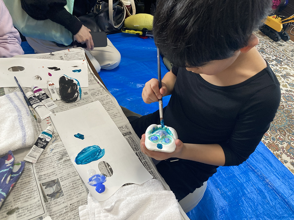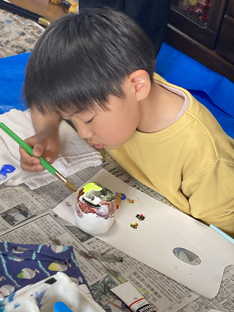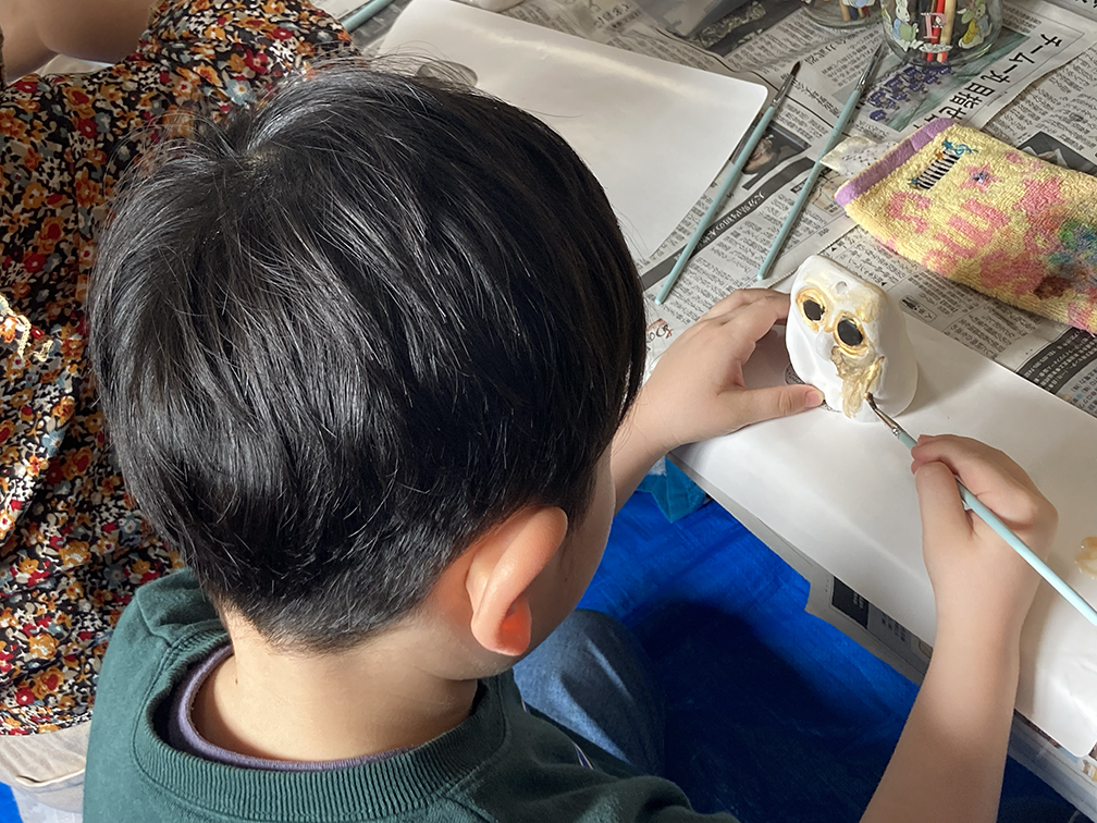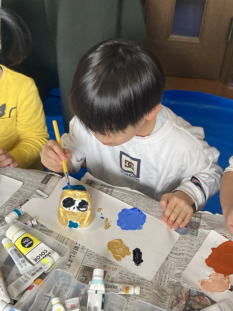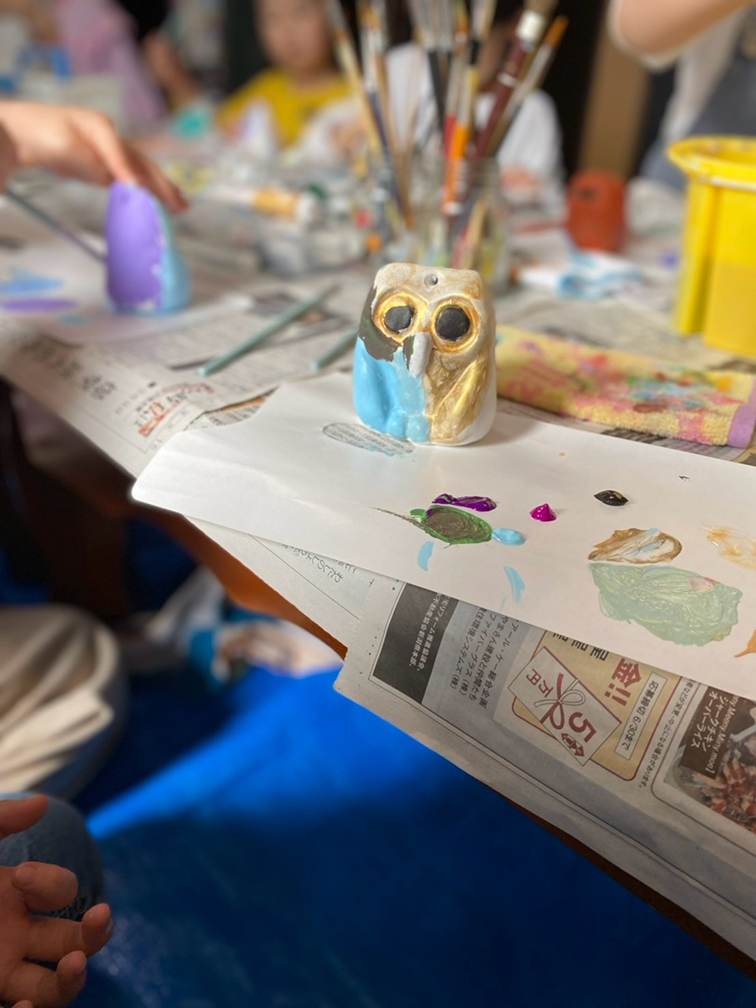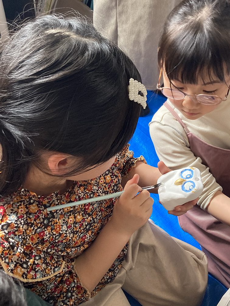 そして、子ども達も楽しみにしてくれている創作の時間では、「ふくろう土人形絵付け」をやりました。今回は、お隣富山県で活動されている「とやま土人形工房」さんから土人形の素焼きを購入させてもらい土鈴・貯金箱の2種類のふくろうに、アクリル絵の具で絵付けをしました。絵の具の扱いがだんだんこなれてきたメンバーたち。今回はメタリックなカラーや蛍光色を追加してみたり、絵の具の準備にもこだわりました。毎回絵の具の使う量もすごいですが(大胆な子もいる!)、色の作り方&塗り方に個性が出てきて本当に面白いです。この時間を共有させてもらって、私たち家族も創作意欲を刺激され、文庫終了後に自分たちも色塗りをするほど(笑)!写真をいっぱい載せておきます⭐︎