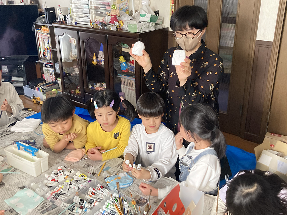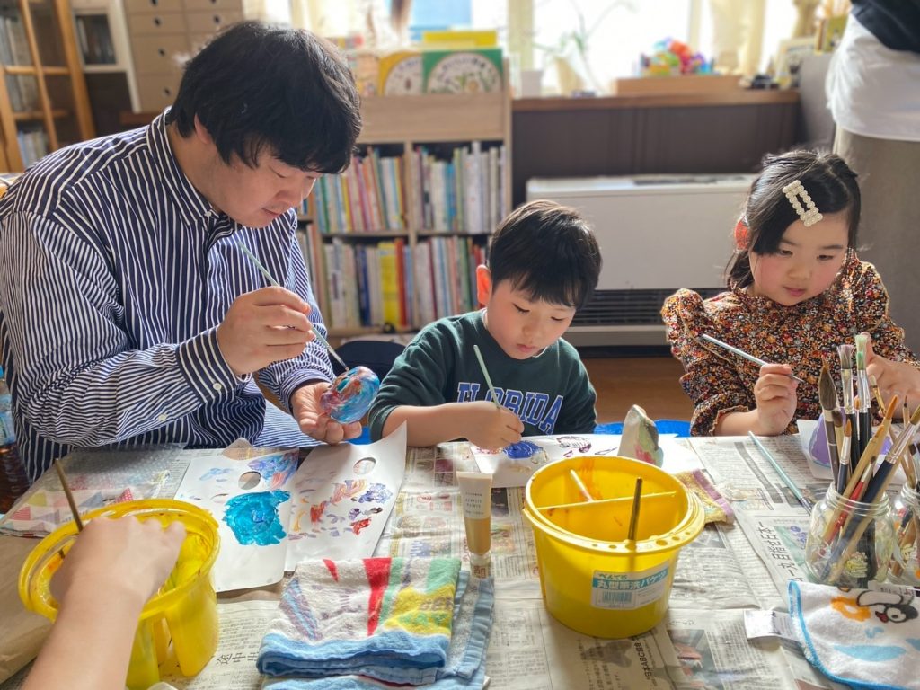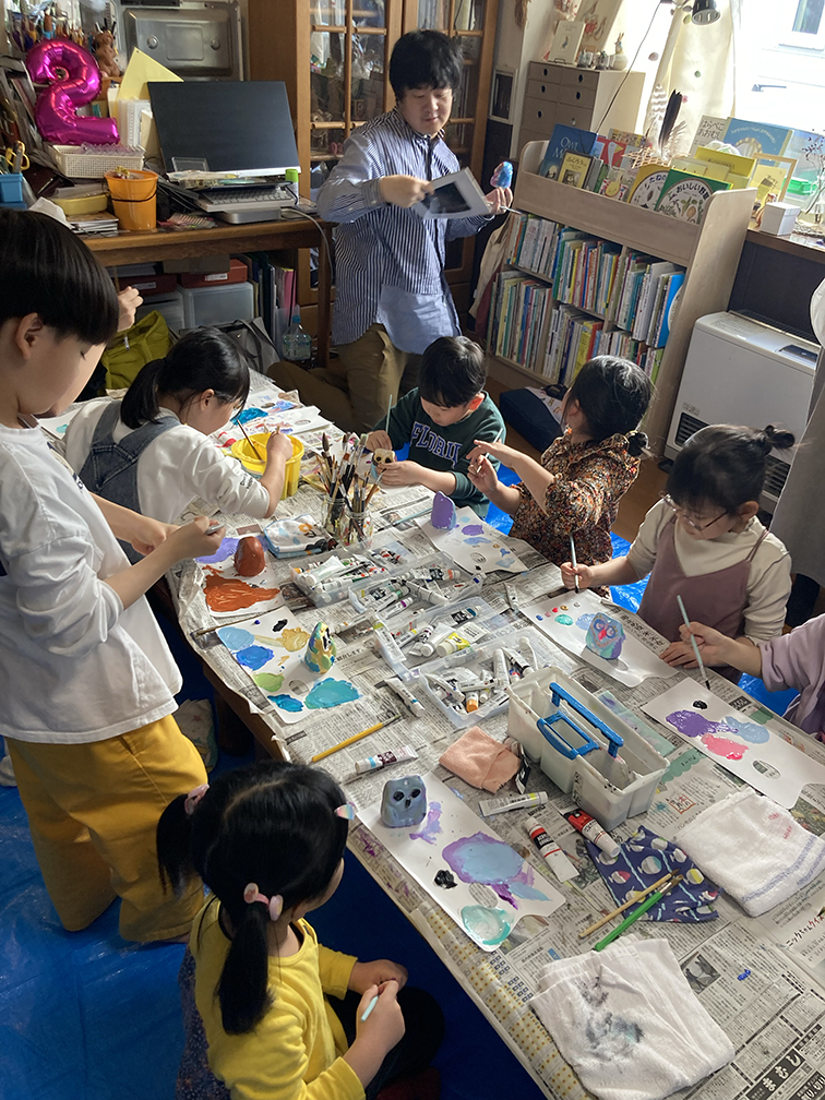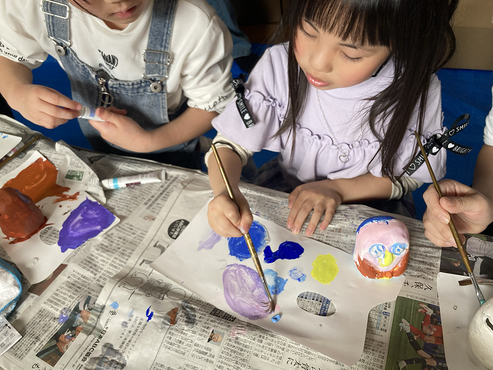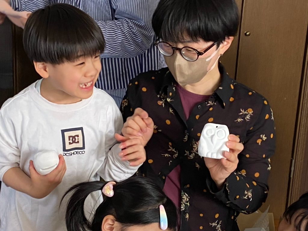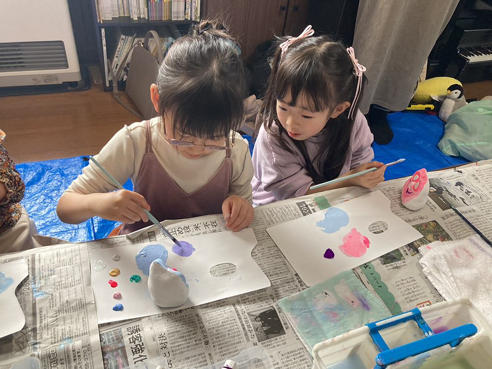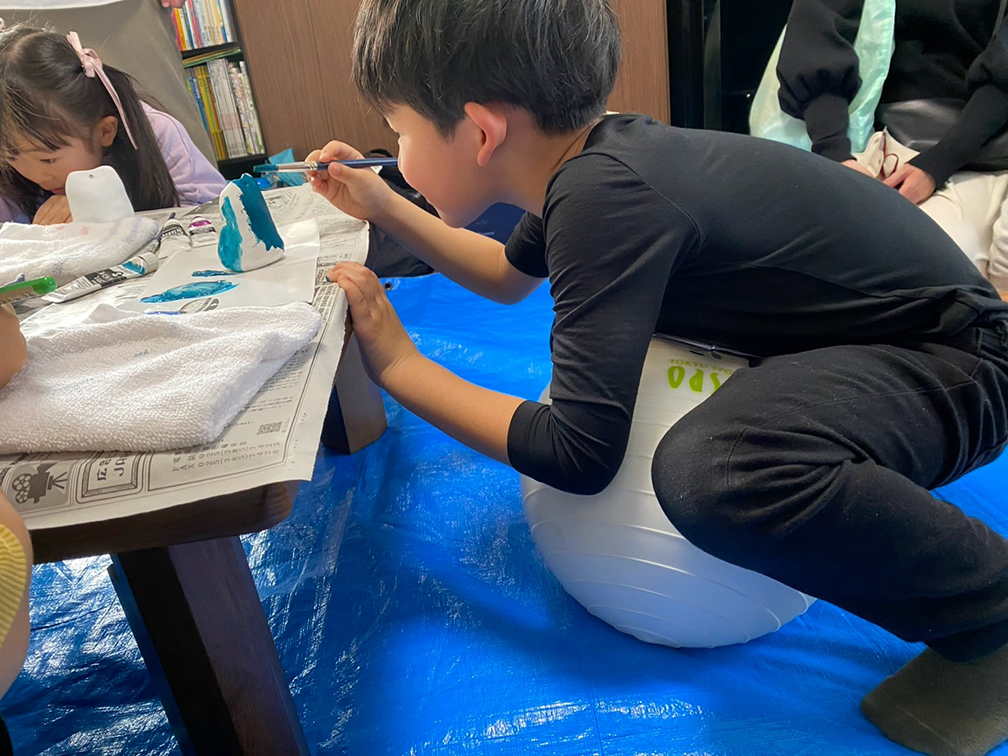 そして、子ども達も楽しみにしてくれている創作の時間では、「ふくろう土人形絵付け」をやりました。今回は、お隣富山県で活動されている「とやま土人形工房」さんから土人形の素焼きを購入させてもらい土鈴・貯金箱の2種類のふくろうに、アクリル絵の具で絵付けをしました。絵の具の扱いがだんだんこなれてきたメンバーたち。今回はメタリックなカラーや蛍光色を追加してみたり、絵の具の準備にもこだわりました。毎回絵の具の使う量もすごいですが(大胆な子もいる!)、色の作り方&塗り方に個性が出てきて本当に面白いです。この時間を共有させてもらって、私たち家族も創作意欲を刺激され、文庫終了後に自分たちも色塗りをするほど(笑)!写真をいっぱい載せておきます⭐︎