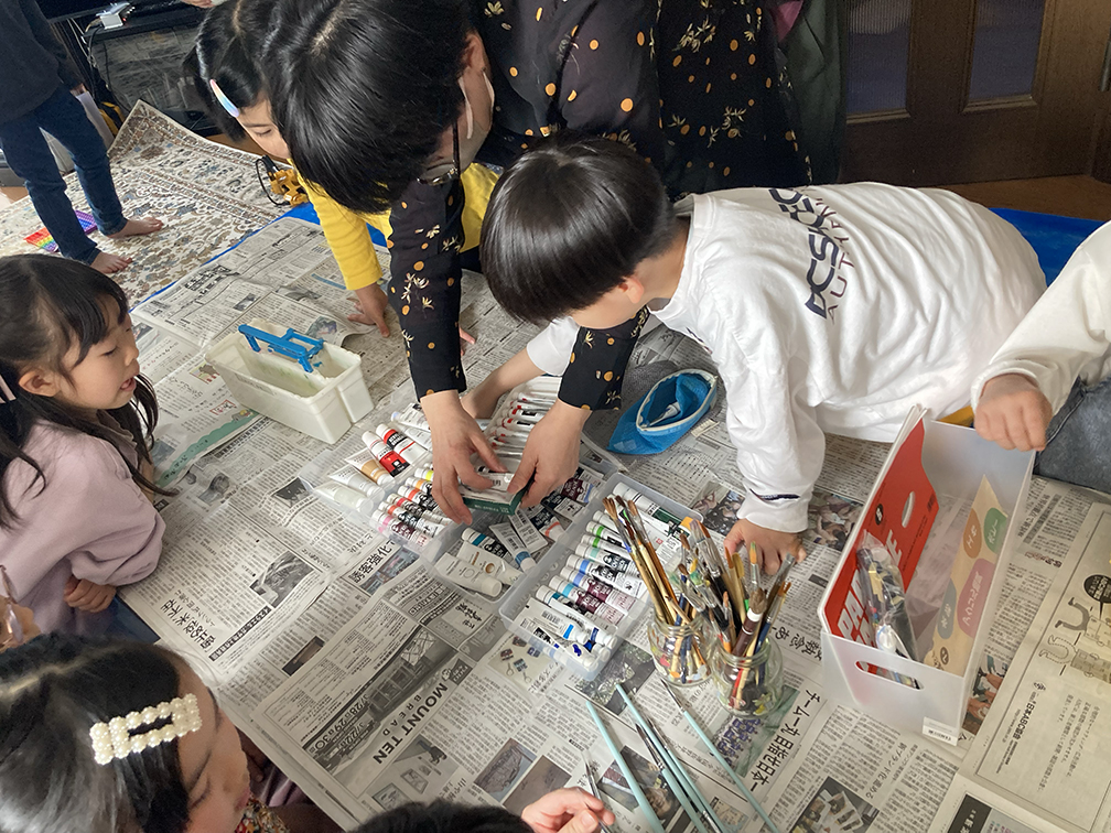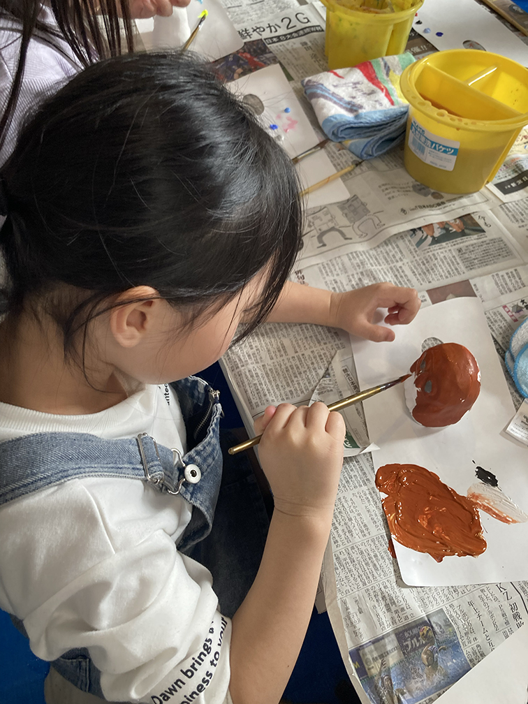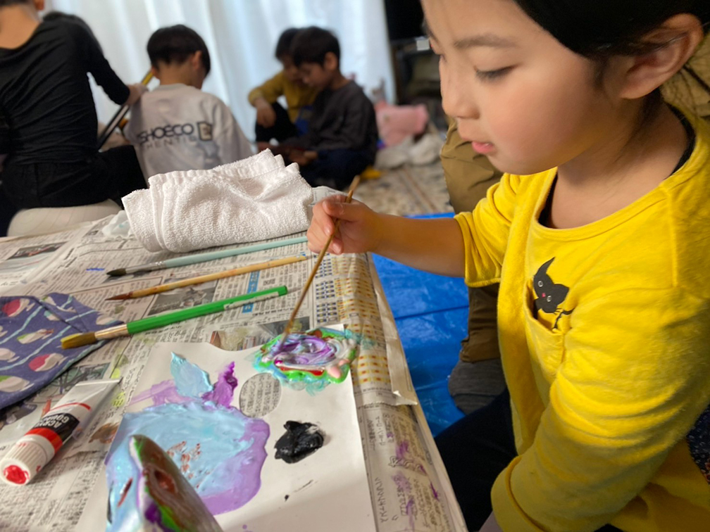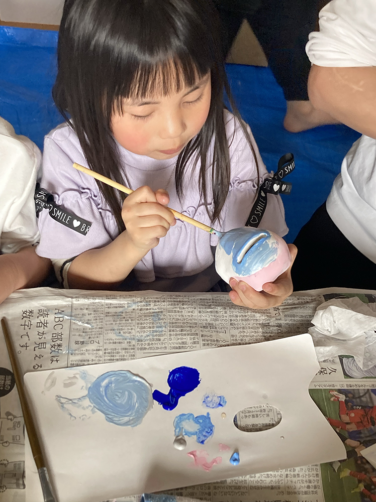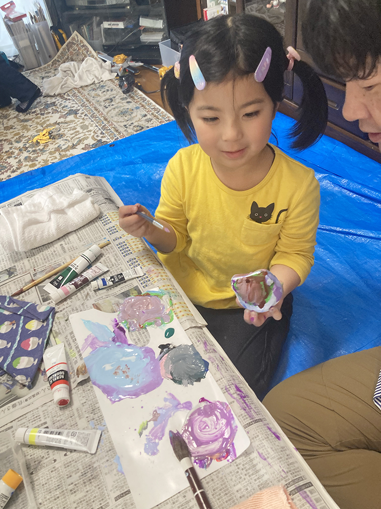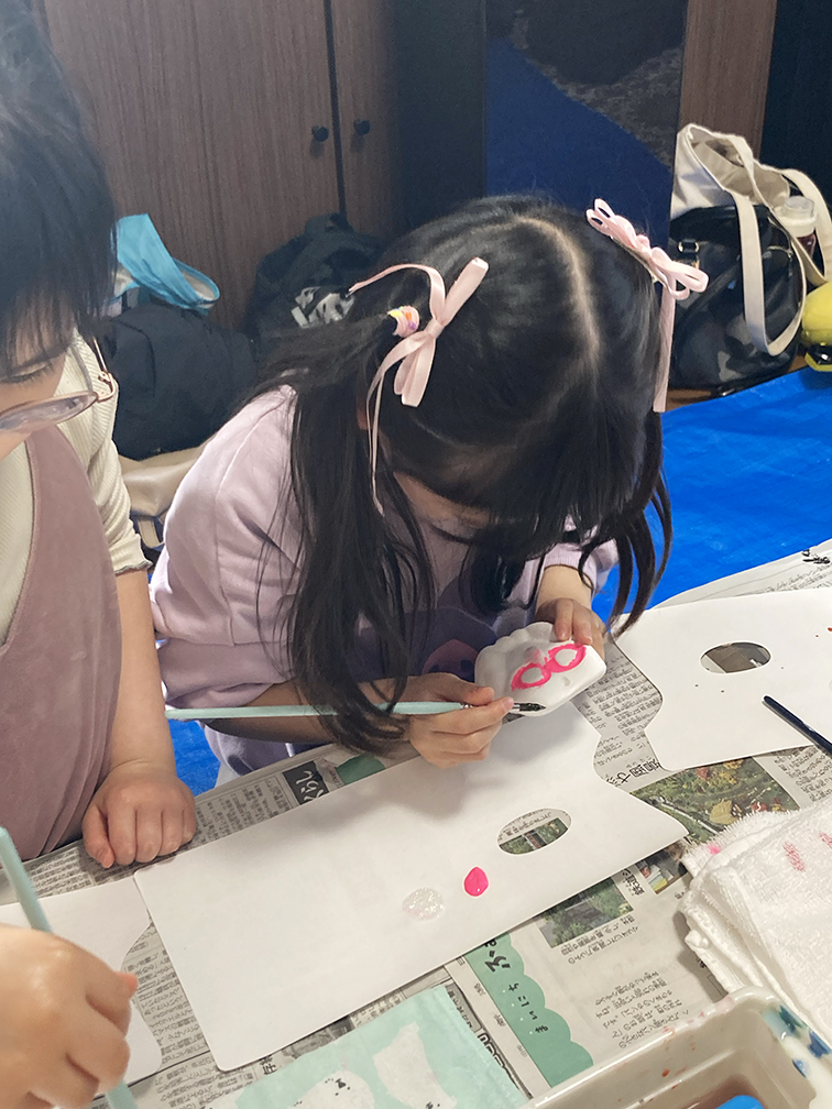 そして、子ども達も楽しみにしてくれている創作の時間では、「ふくろう土人形絵付け」をやりました。今回は、お隣富山県で活動されている「とやま土人形工房」さんから土人形の素焼きを購入させてもらい土鈴・貯金箱の2種類のふくろうに、アクリル絵の具で絵付けをしました。絵の具の扱いがだんだんこなれてきたメンバーたち。今回はメタリックなカラーや蛍光色を追加してみたり、絵の具の準備にもこだわりました。毎回絵の具の使う量もすごいですが(大胆な子もいる!)、色の作り方&塗り方に個性が出てきて本当に面白いです。この時間を共有させてもらって、私たち家族も創作意欲を刺激され、文庫終了後に自分たちも色塗りをするほど(笑)!写真をいっぱい載せておきます⭐︎