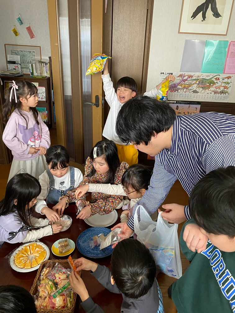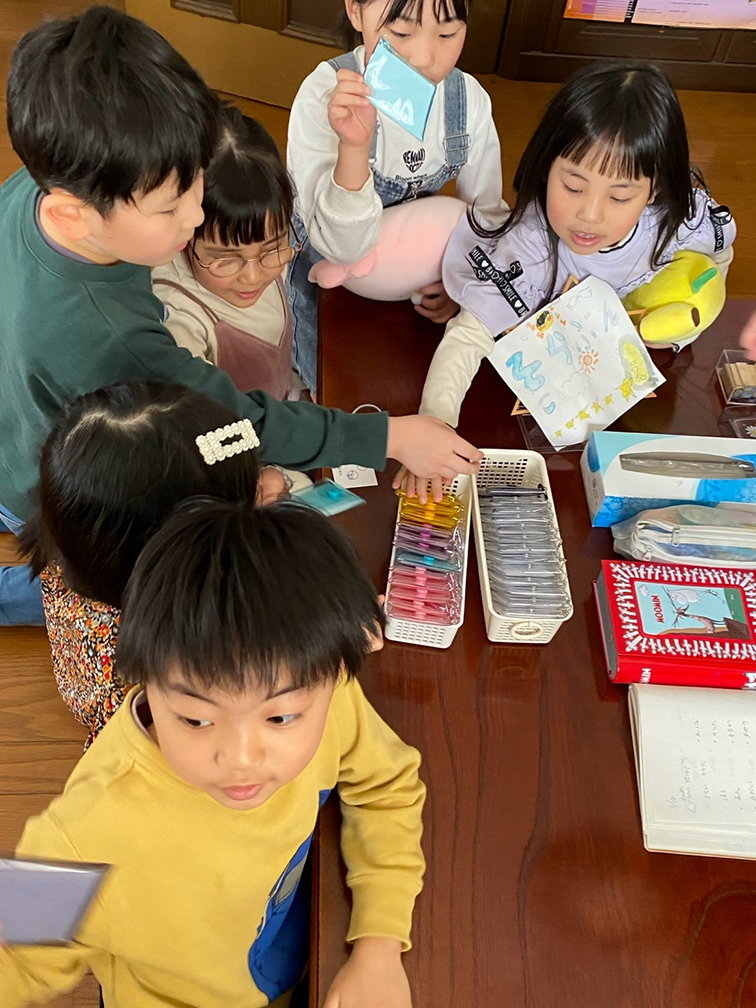 この日「祝・進級・入学・2周年!!」というおめでたいテーマで開催した「3月の会」は、まず記念品のプレゼントから始まりました。好きな色のクリアポーチに、「天良文庫2周年記念シール」を好きな場所に貼ってもらいました。嬉しいサプライズで、文庫メンバーのAちゃんとママさんが、「2」の風船と「そらぶんこ」を描いた絵を持ってきてくれたので、一緒に記念写真をぱちり!この春小学校へ入学していくメンバー達、みんな大きくなったなぁと改めて感じます。