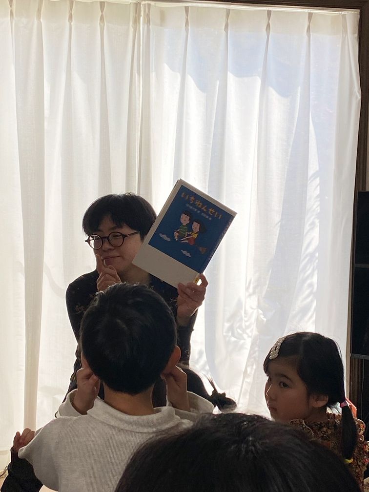 そして、3月の詩&絵本の時間へ。3月の詩は、谷川俊太郎さんの『いちねんせい』より「なまえ」をチョイス。小学校に入ると名前を自分でノートに書きます。自分の名前を自分で書ける喜び。なんだか誇らしい気持ち。もう自分は赤ちゃんじゃないぞ、、、みたいな? みんなも実感があるかなと思って読みました。和田誠さんの絵入りのこの詩集。もし小学校入学のタイミングのお子さんが周囲にいたら贈り物にもおすすめです。息子達の保育園の先生も3月の会の案内を見て「谷川さん、こんな絵本もあったんですね〜」と反応してくれました。文庫では2度目の登場でした。